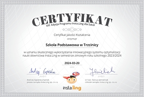 XXI edycja programu InstaLing dla szkół jest już za nami i mamy kolejny sukces. Nasza szkoła ponownie otrzymała Certyfikat Jakości Kształcenia w uznaniu skutecznego wykorzystania ...