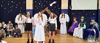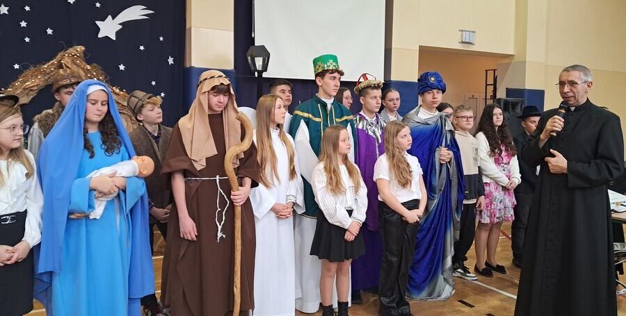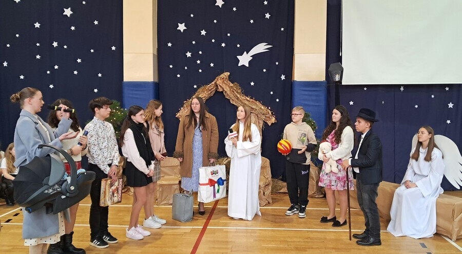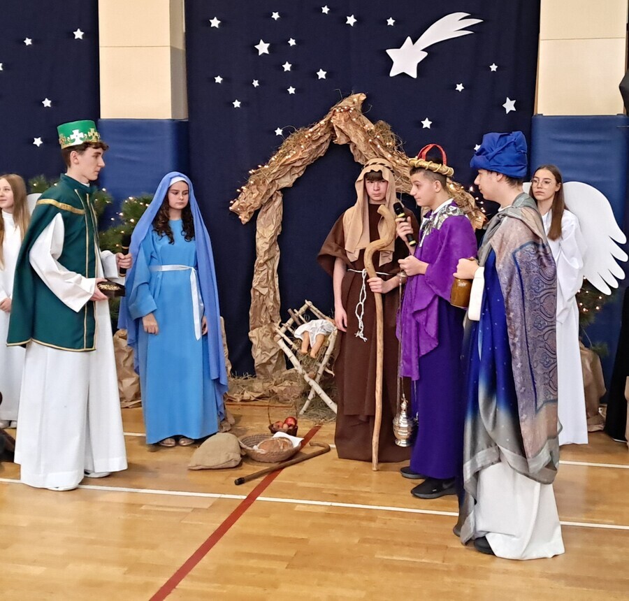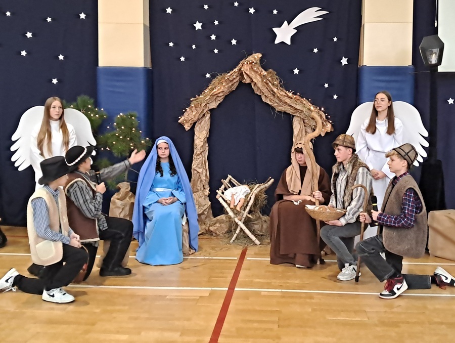 Nasze tradycyjne kolędowanie poprzedziło przedstawienie bożonarodzeniowe z ważnym przesłaniem dla nas wszystkich – byśmy wiedzieli co w tym czasie powinno być dla nas najważniejsze. Jasełka w przepięknym wykonaniu uczniów klas VII i VIII zostały przygotowane przez panie: Beatę Więcek-Szczurowską, Lidię Jerczyńską, Agnieszkę Podejmę-Wróblewską oraz Ewę Gaze.