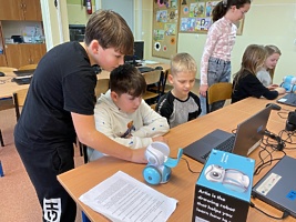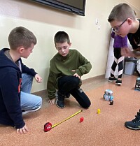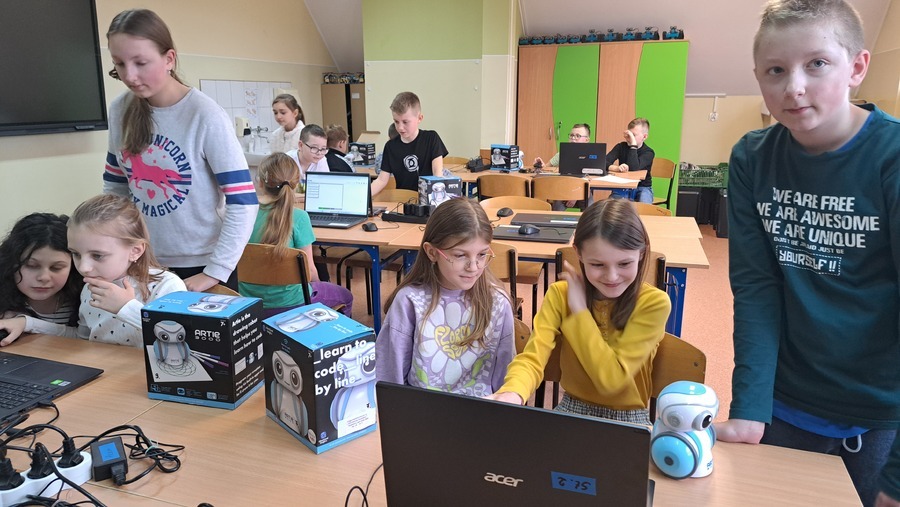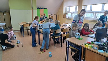 Pod czujnym okiem starszych kolegów z piątej klasy wzbogacali swoje doświadczenia w zakresie programowania. Uczestnicy zajęć byli poruszeni możliwościami tego podstawowego sprzętu. Już teraz czekają na kolejny etap programowania w klasie czwartej, na który zaprosiła ich pani Magdalena Wypych - opiekun pracowni informatycznej i pracowni robotyki.