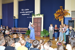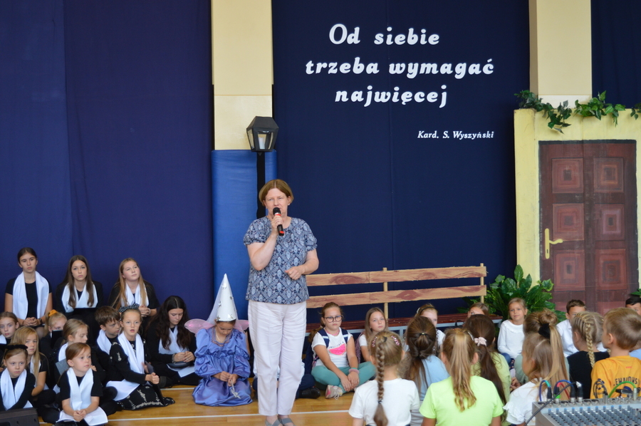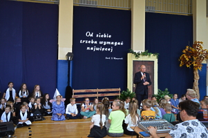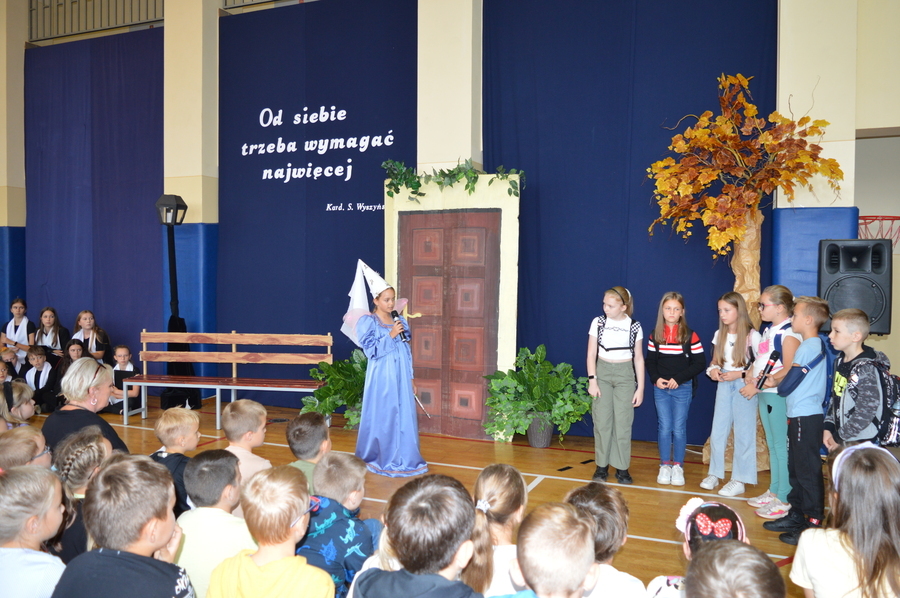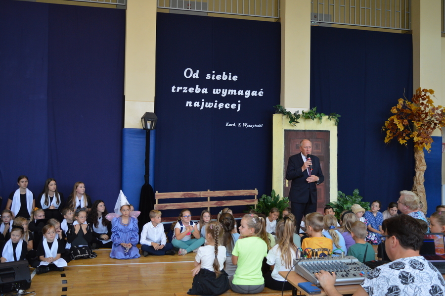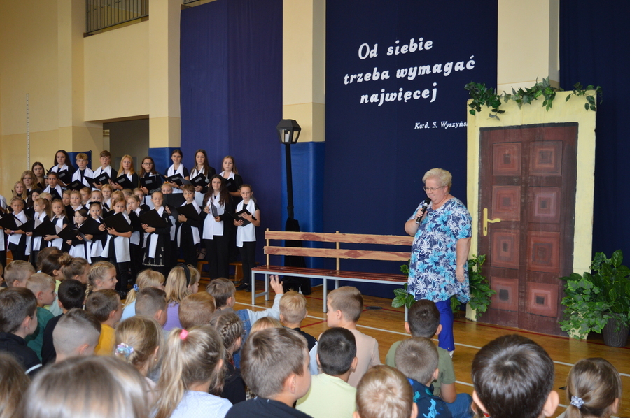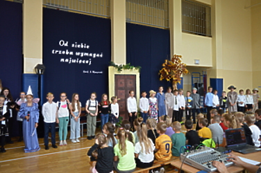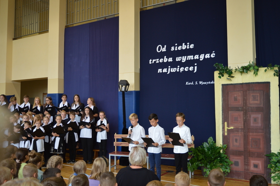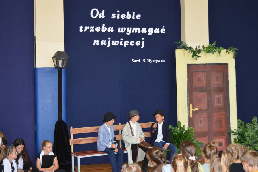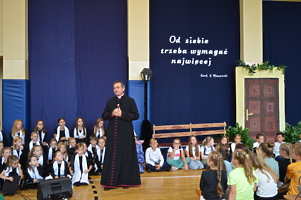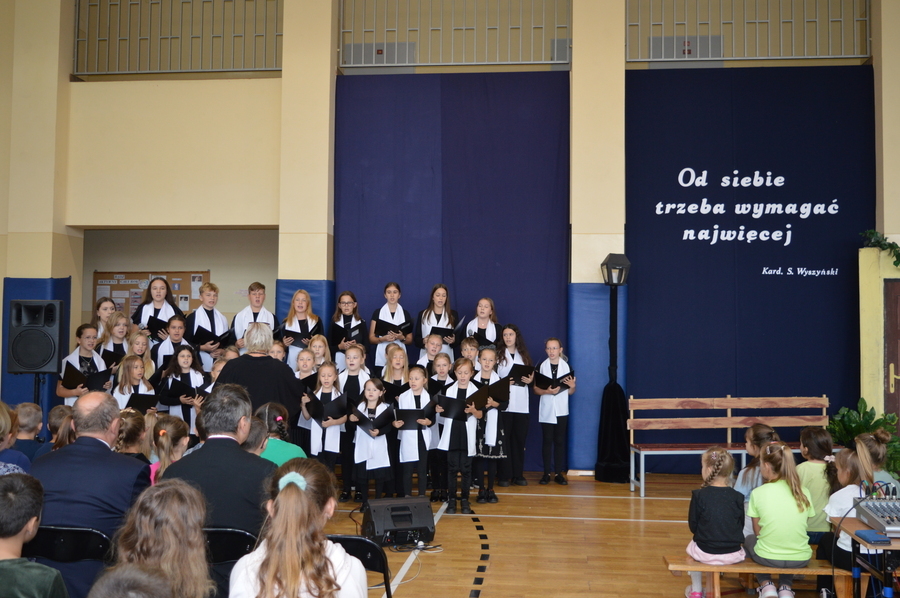 26 września obchodziliśmy rocznicę internowania Patrona naszej szkoły – bł. kard. Stefana Wyszyńskiego. Wydarzenie to wpisało się już na stałe w nasz szkolny kalendarz. To czas, w którym zawsze wspominamy wartości jakimi kierował się w życiu Stefan Wyszyński. Uroczystości rozpoczęła dyrektor szkoły Ewa Hetmańczyk, witając zaproszonych gości oraz wprowadzając uczniów w temat spotkania. Następnie odbył się uroczysty apel, który przygotowali uczniowie klasy IV. Dzięki nim wszyscy przenieśli się na chwilę w czas aresztowania Prymasa. Występom czwartoklasistów towarzyszył Chór NUTKA.