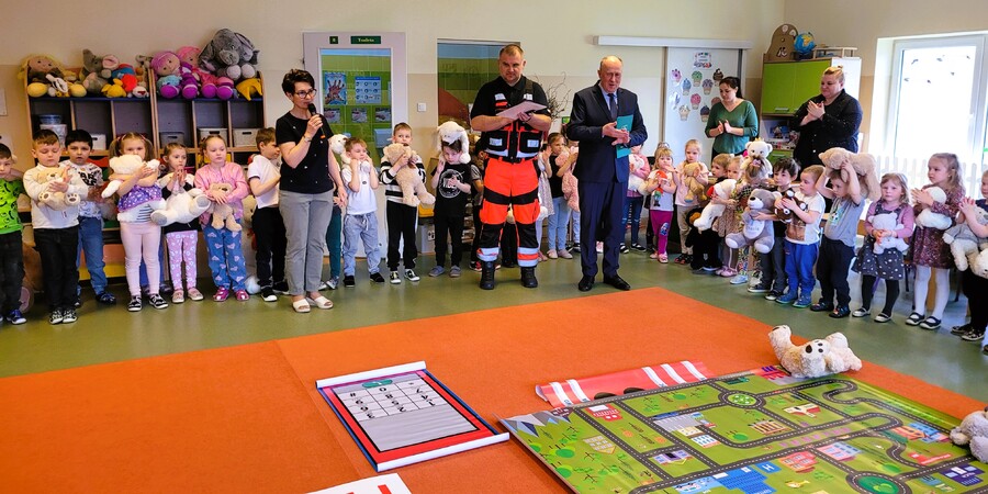 Gościa wspólnie z dziećmi powitał Wójt Gminy Trzcinica pan Grzegorz Hadzik, który na ręce ratownika przekazał podziękowanie za realizację wspaniałych zajęć z przedszkolakami z zakresu zdrowia.
