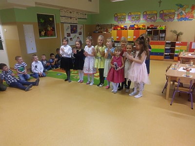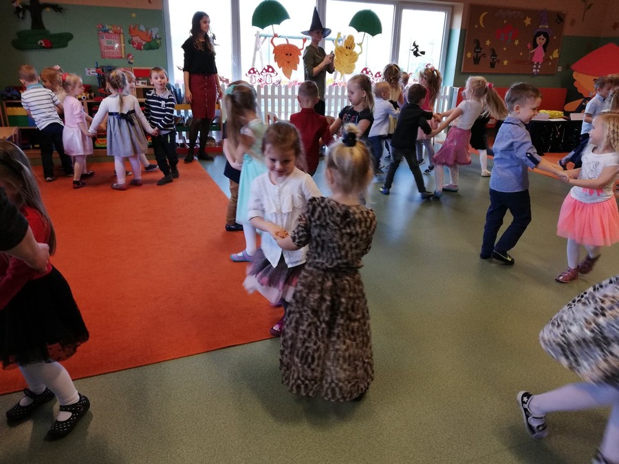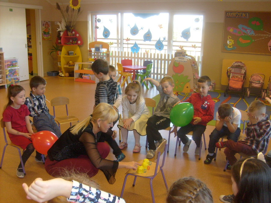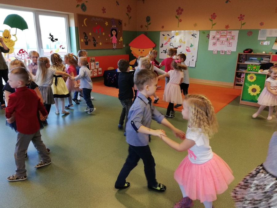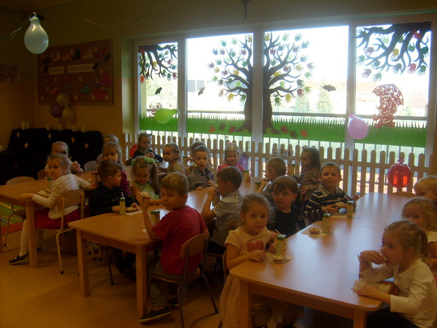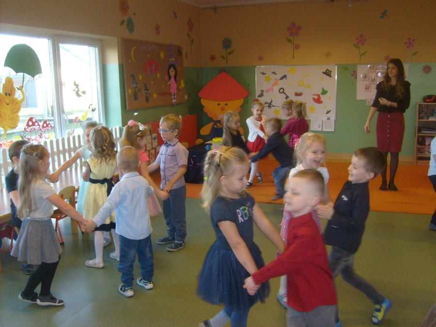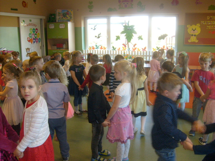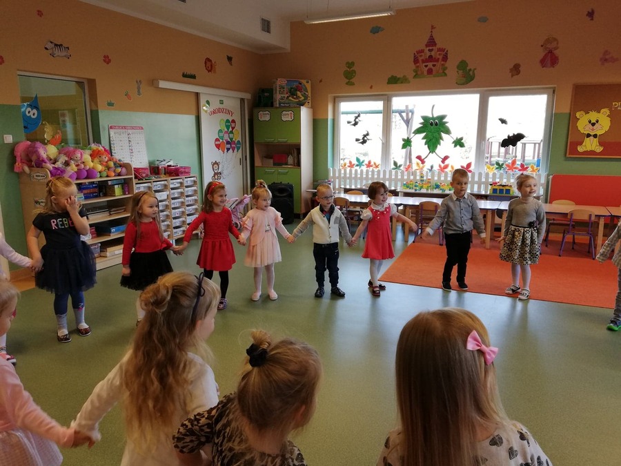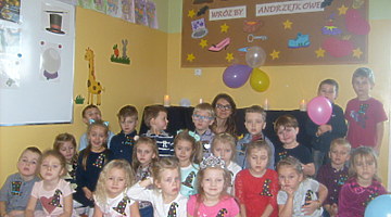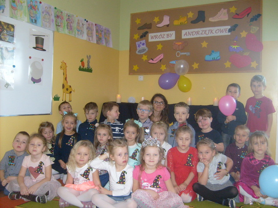 W piątek 30 listopada w imieniny Andrzeja przedszkolacy uczestniczyli we wróżbach andrzejkowych. Rozmowy o tradycjach ludowych związanych z tym dniem prowadzone były już wcześniej. Dzieci we wszystkich grupach przygotowywały się wykonując ozdoby i ćwicząc tańce. Różnorodność wróżb i stworzenie przez nauczycielki magicznego nastroju z przygaszonym światłem sprawiły, że dzień ten stał się jak ze świata baśni. Rodzice przygotowali specjalne kotyliony, które ucieszyły wszystkie dzieci. Zabawa przy muzyce z dziecięcego repertuaru i popularnych przebojów pozwoliła powrócić do rzeczywistości. Rada Rodziców zadbała, aby przedszkolakom w tej wyśmienitej zabawie nie zabrakło sił przygotowując dla nich babeczkowy poczęstunek z napojami.