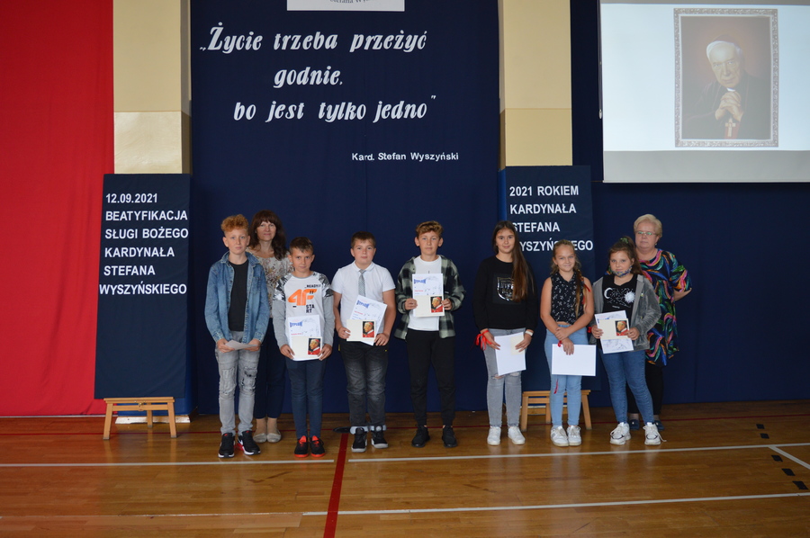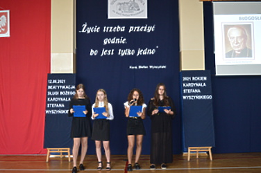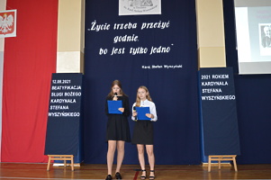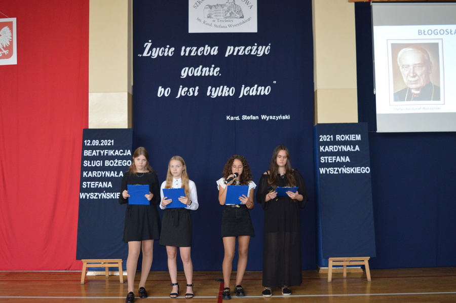 12 września 2021r. odbyła się beatyfikacja Patrona Naszej Szkoły Kardynała Stefana Wyszyńskiego. Aby uczcić to wydarzenie uczniowie naszej szkoły pod kierunkiem nauczycieli przygotowali apel, którego myślą przewodnią były słowa naszego Patrona „Życie trzeba przeżyć godnie, bo jest tylko jedno”.