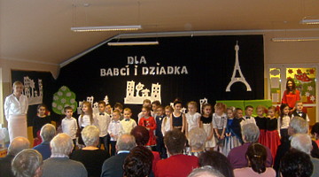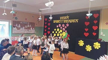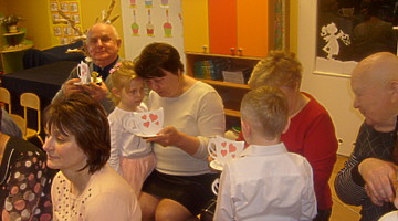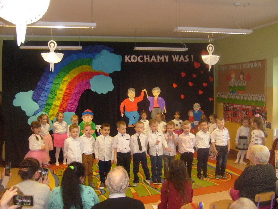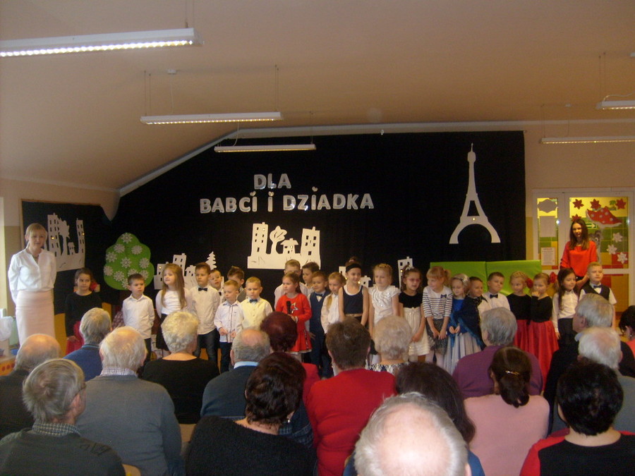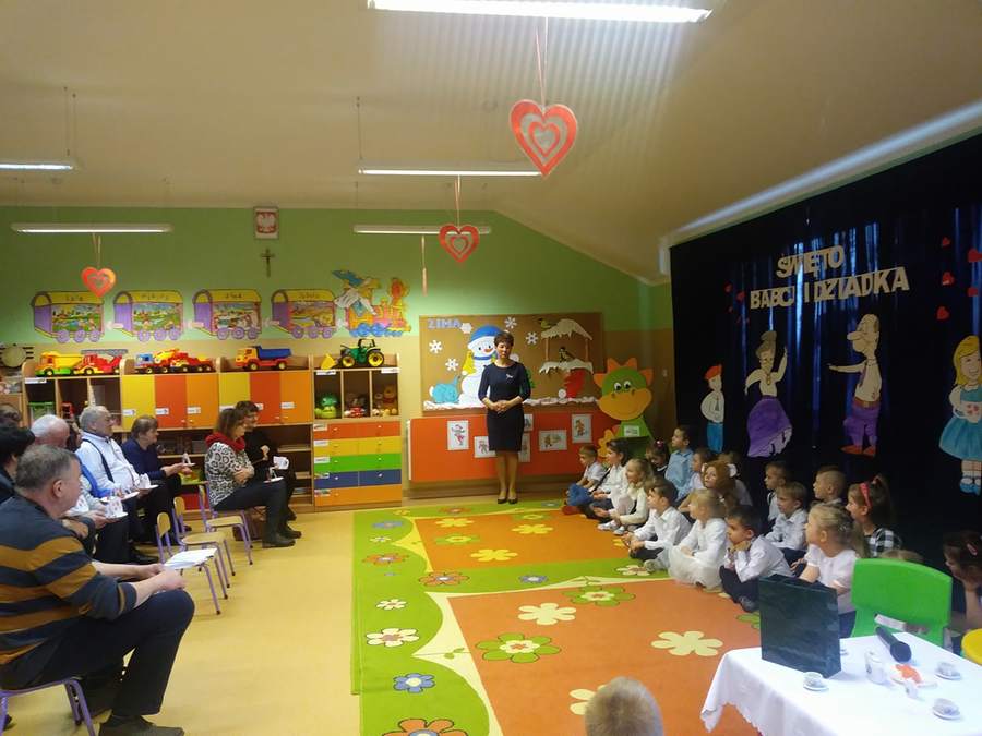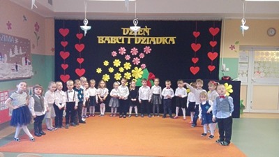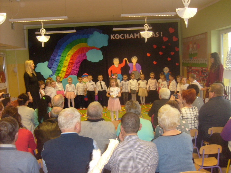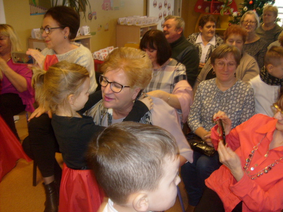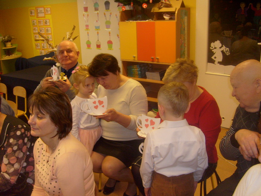 Młodsze dzieci zachwycały swoich gości życzeniami i prezentacją taneczną ze śpiewem nawet w języku angielskim. Wszystkie dzieci wręczyły swoim kochanym dziadkom w prezencie filiżankę, a w niej herbatkę i na talerzyku cukierek na dokładkę. Panie Małgorzata Hadzik i Ewa Hetmańczyk – złożyły wszystkim gościom życzenia i podziękowały za udane występy dzieci.