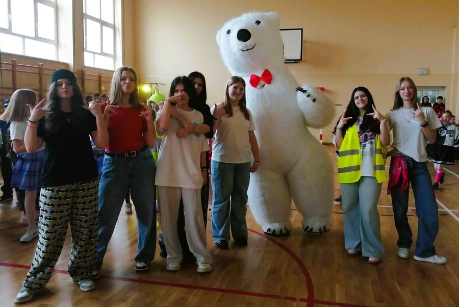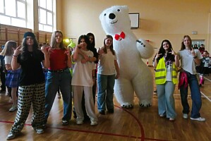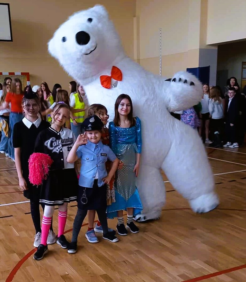 Dziękujemy bardzo za poczęstunek przygotowany dla wszystkich uczniów przez Radę Rodziców oraz super niespodziankę w postaci polarnego niedźwiedzia, który pląsał z uczniami w obu grupach.