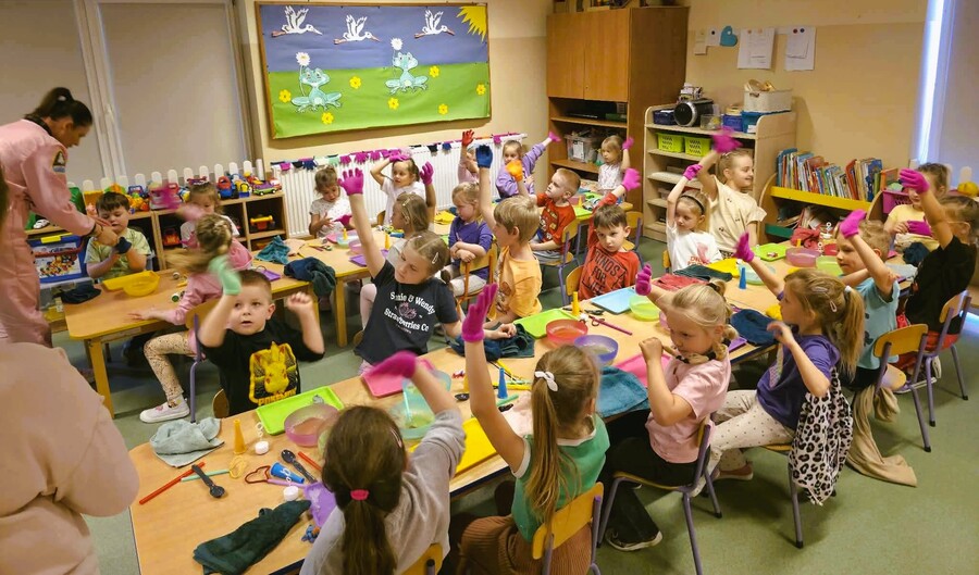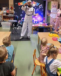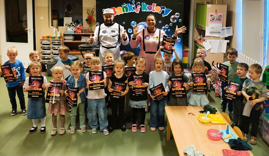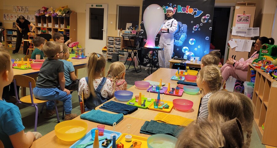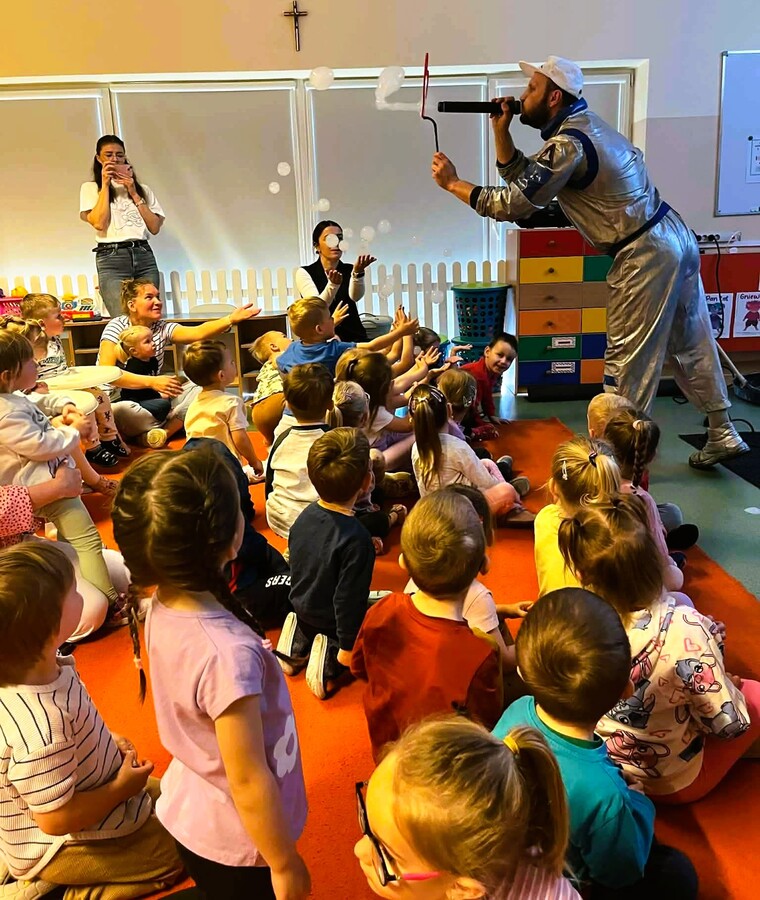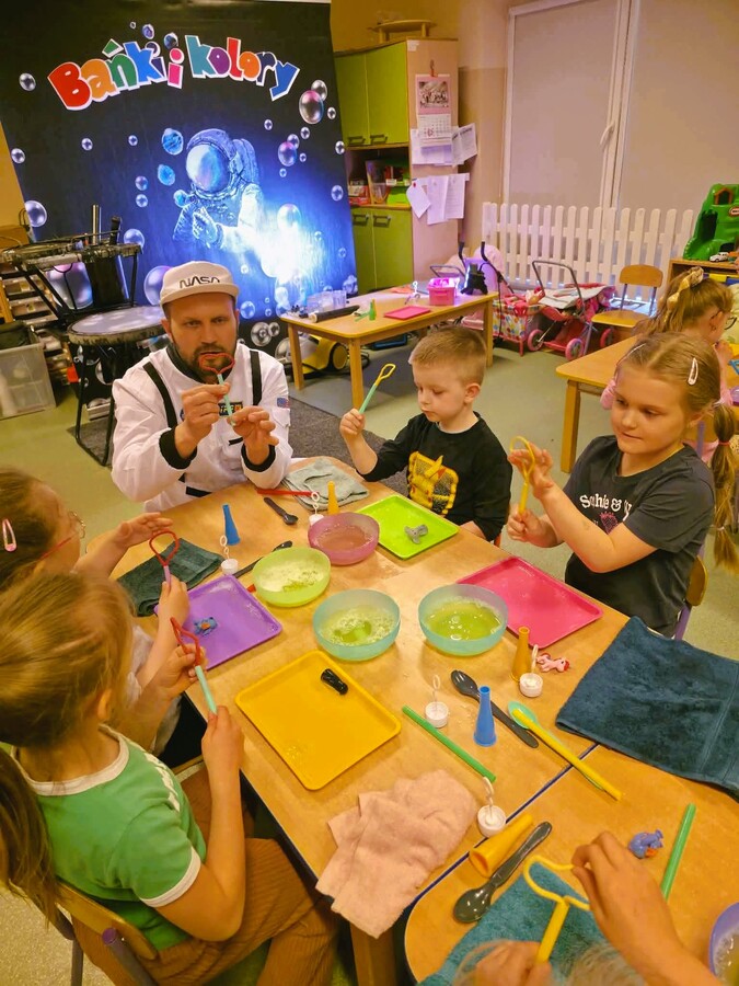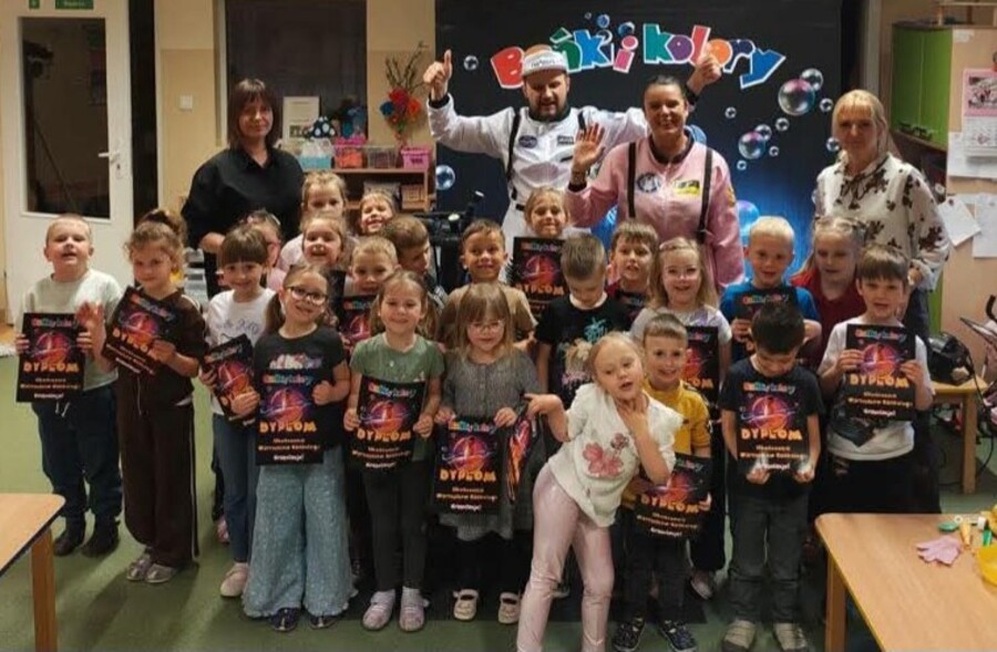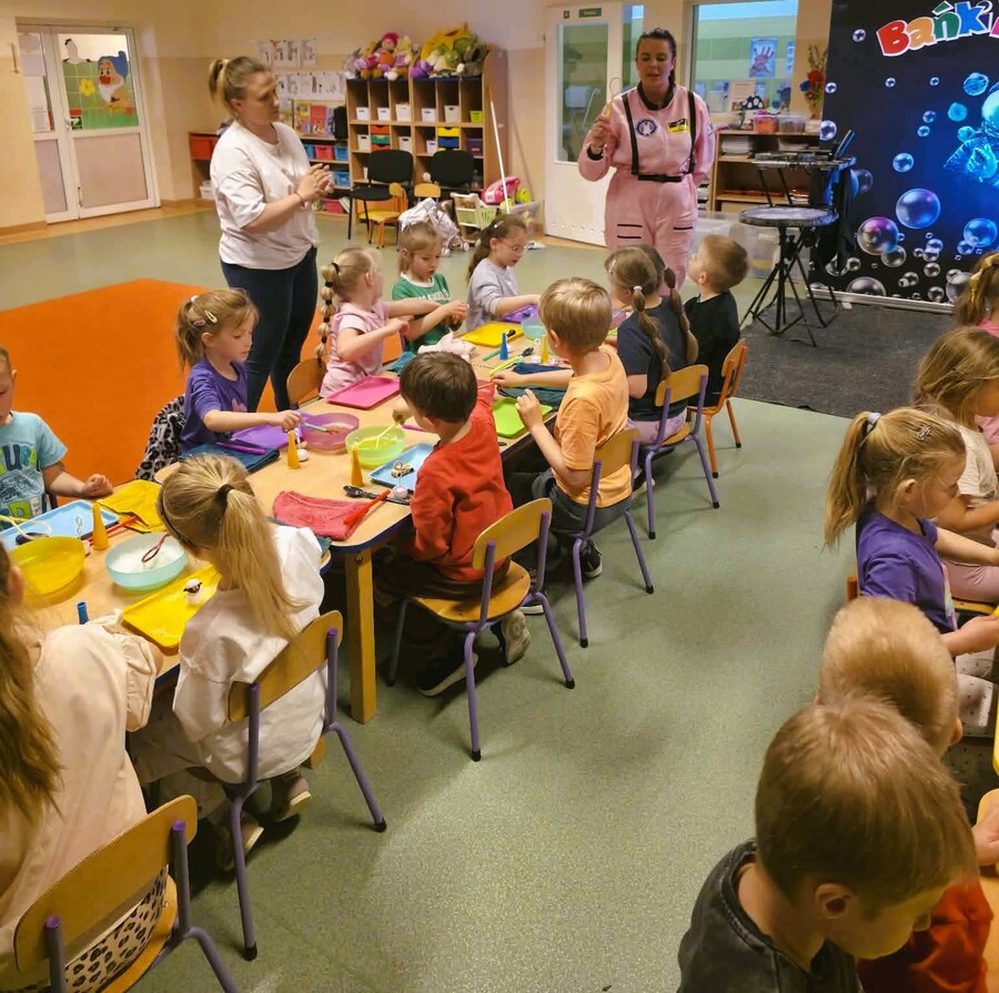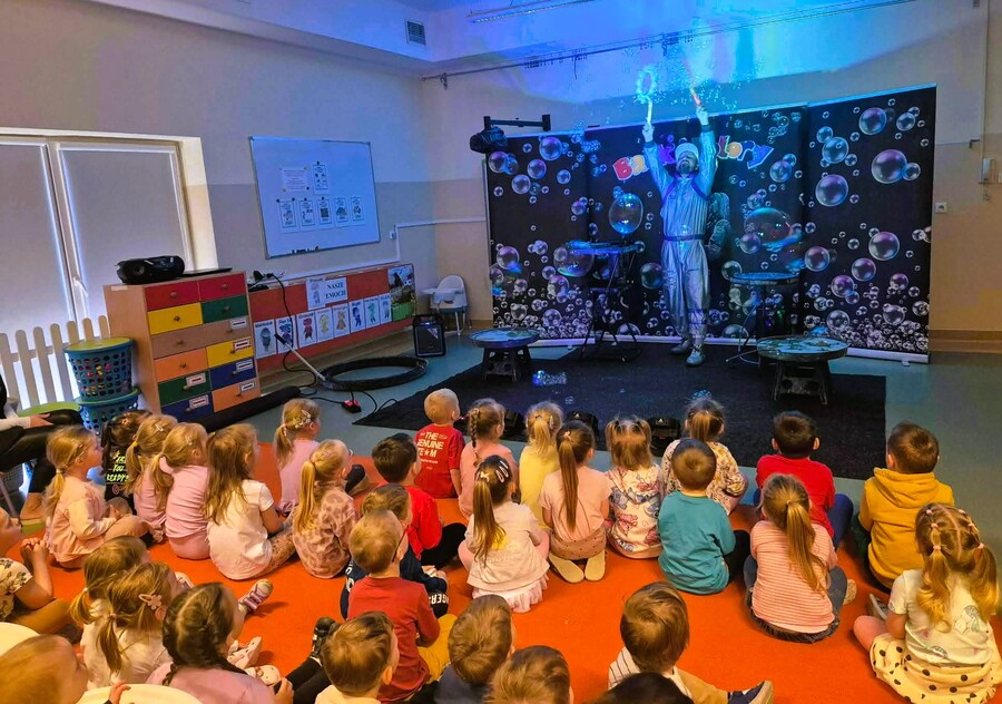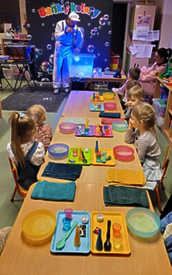 Młodsza grupa przedszkolna uczestniczyła w bajecznym pokazie bańkowy, pełnymi różnorodnych kształtów. Były wiec bańki okrągłe, owalne, kwadratowe i ogniste. Dzieci miały również możliwość znalezienia się wewnątrz bańki i w ten sposób stać się częścią samego pokazu.