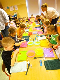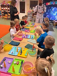 Dla starszych przedszkolaków przygotowane zostały bańkowe warsztaty, podczas których dzieci samodzielnie aktywnie pracowały nad elementami różnych efektów z bańkami: bańka na dłoni, zabawka w bańce, czy też mnóstwo baniek w jednej chwili. Warsztaty zaowocowały cudowną zabawą i zakończyły się wręczeniem pamiątkowych dyplomów.