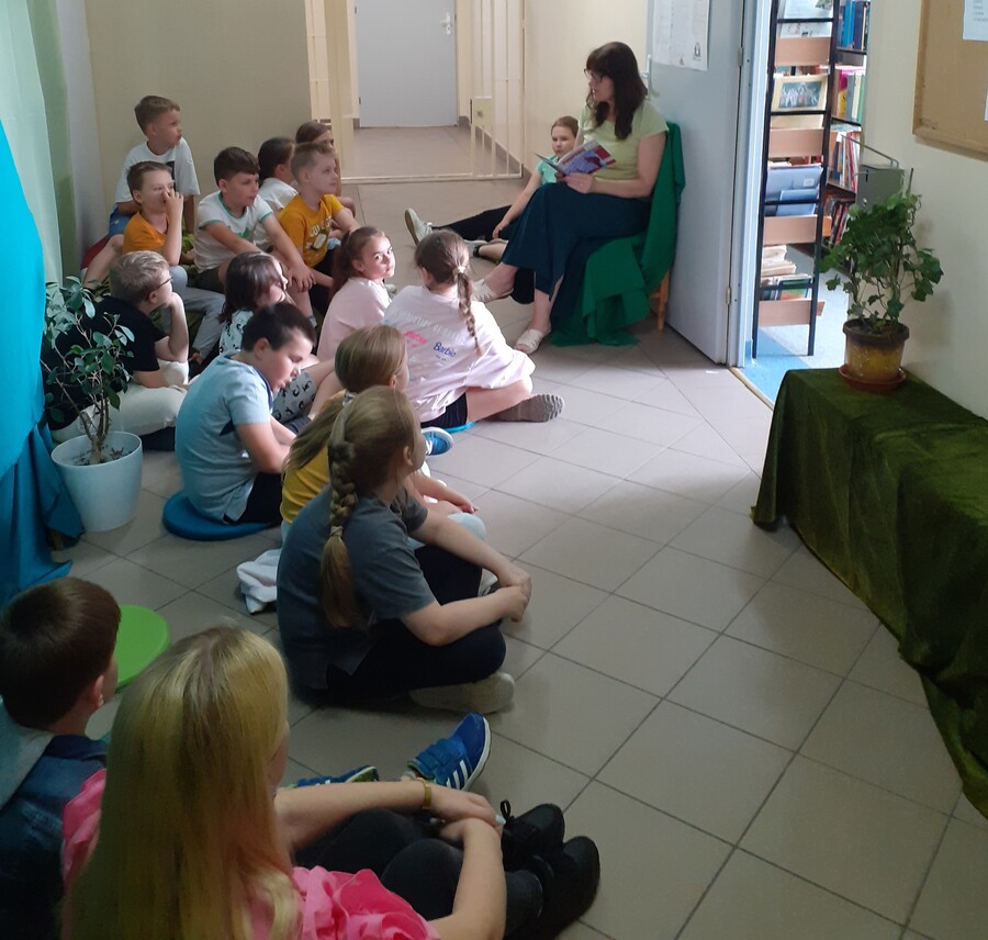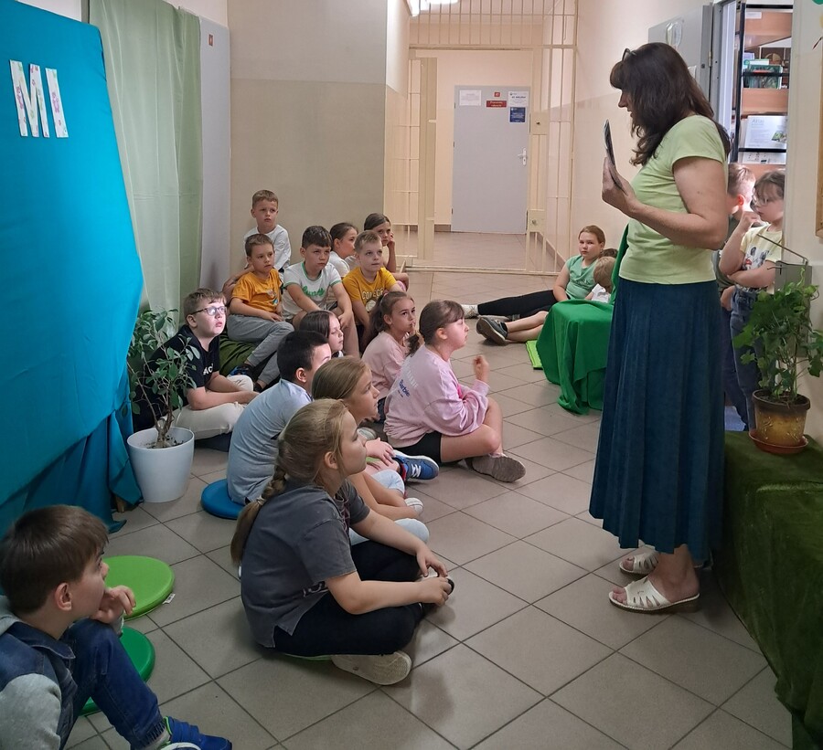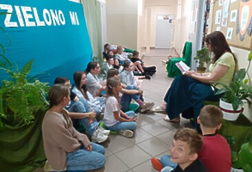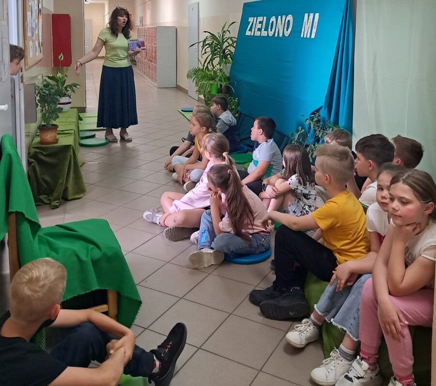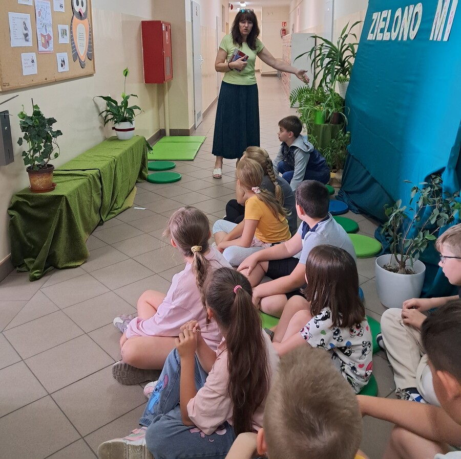 Na poczet realizacji projektu zaadoptowany został również korytarz. Tuż przy bibliotece rozlała się zielona kraina roślin, zielonych poduszek i materacy, gdzie rozsiadały się wygodnie dzieci z klas I-IV, które przychodziły na ekologiczno-literackie zajęcia. Podczas spotkań z uczniami nauczyciel bibliotekarz – pani Ewa Gaze czytała dzieciom ekologiczne bajki i wiersze, a następnie rozmawiała o konieczności dbania o środowisko naturalne, tematyka zajęć dotyczyła również zdrowego oddechu, a jako pomoce naukowe w zajęciach wykorzystane zostały kwiaty ze szkolnych klas i korytarzy, których jedną z funkcji jest pochłanianie zanieczyszczeń.