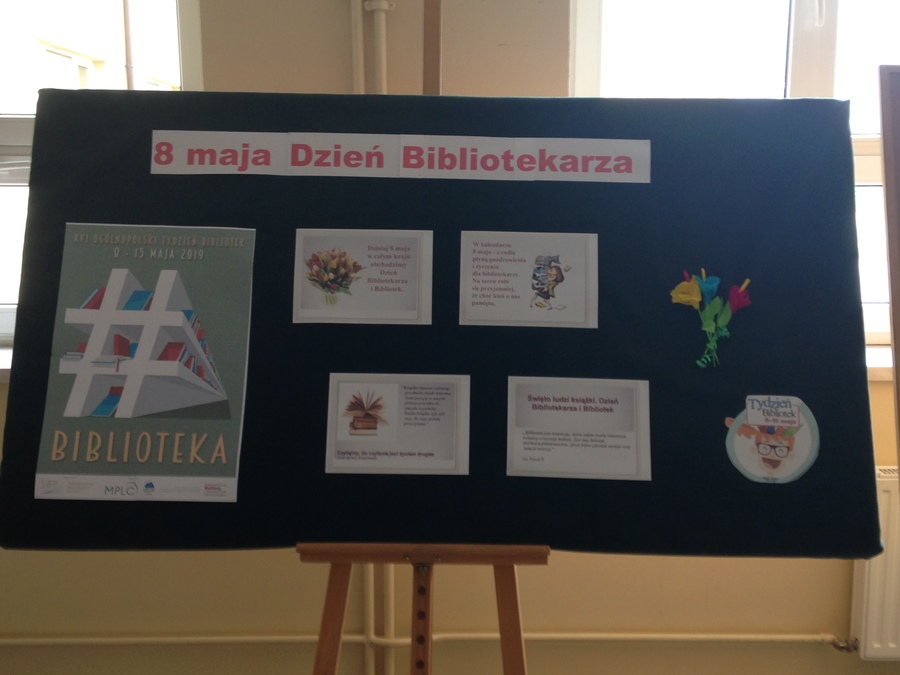Co roku 8 maja obchodzony jest ogólnopolski Dzień Bibliotekarza i Bibliotek, który został zainicjowany przez Stowarzyszenie Bibliotekarzy Polskich. W tym roku biblioteka Zespołu Szkół w Trzcinicy włączyła się w obchody tego święta. 8 maja 2019r. uczniowie mogli obejrzeć wystawę na temat historii powstania tego święta. W tym dniu biblioteka przeprowadziła również konkurs „Z biblioteką za pan brat”, który skierowany był do uczniów klas IV-VIII i III gimnazjum. Zadaniem konkursowym było podanie odpowiedzi na 5 pytań dotyczących książek. Wśród uczestników konkursu zostały rozlosowane nagrody, każdy otrzymał pamiątkowy dyplom i słodki upominek.