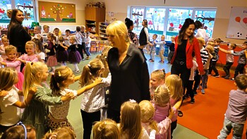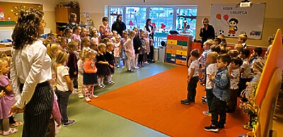 Obchody rozpoczęło wspólne spotkanie wszystkich przedszkolaków. Były życzenia, upominki ufundowane przez Radę Rodziców i gromkie STO-LAT od dziewczynek dla chłopców.