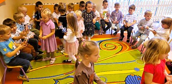 Tworząc kolorowe pociągi, tanecznym krokiem ruszyliśmy we wspólną muzyczną podróż. Po krótkim spotkaniu wszystkich grup i rozśpiewanych pociągach, dzieci wróciły do swoich sal.