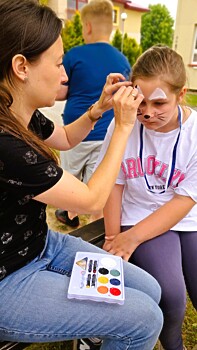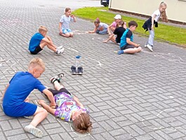 Młodsi uczniowie dodatkowo ubarwili wesoło twarze i wypełnili swoimi rysunkami plac wewnętrzny.