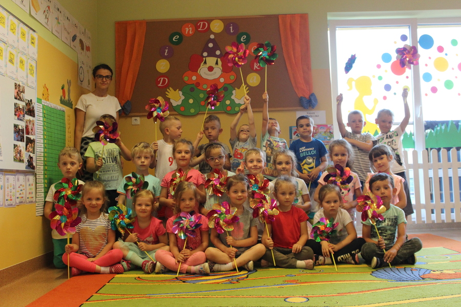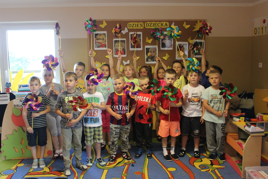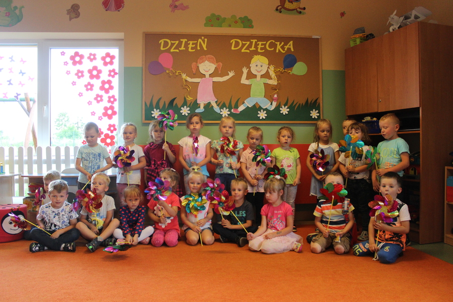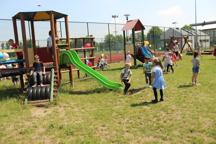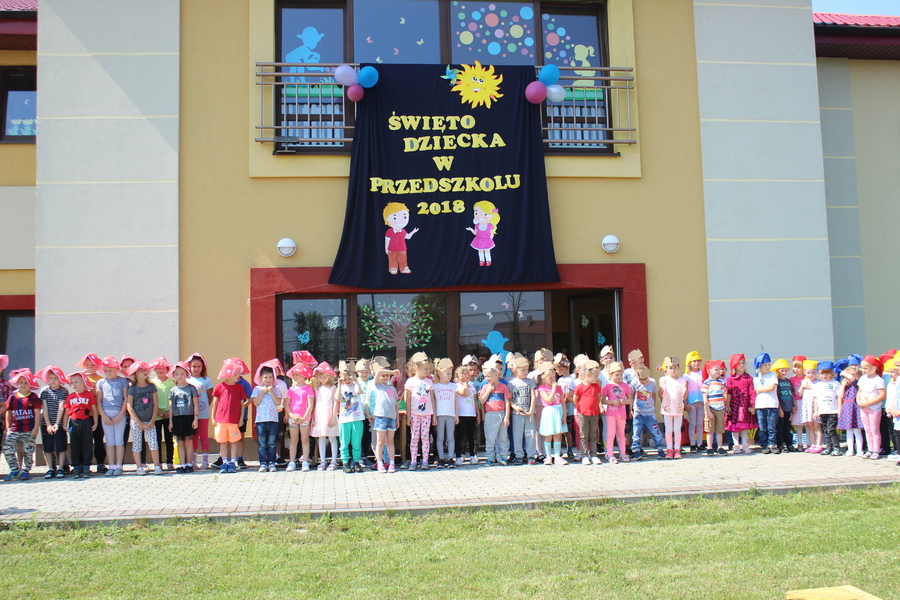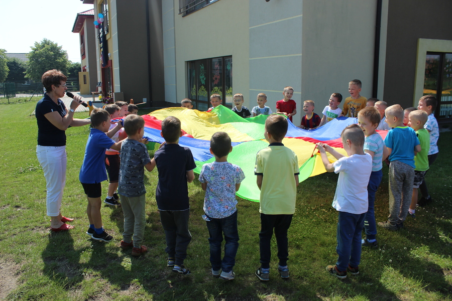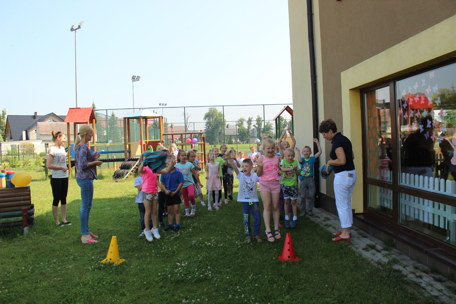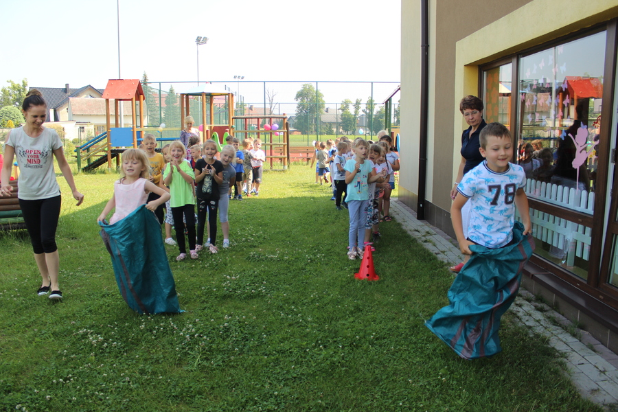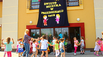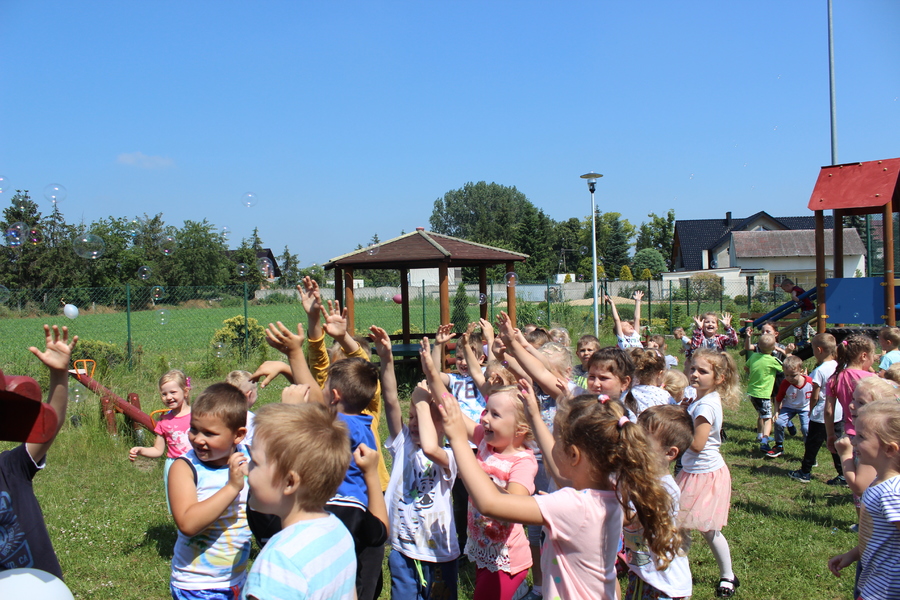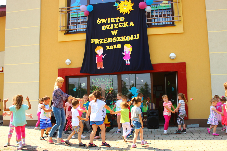 W poniedziałek 4 czerwca w przedszkolu odbył się Dzień Dziecka. Świętowanie polegało na wspólnym spotkaniu się wszystkich grup przedszkolnych na przedszkolnym placu zabaw. Nauczycielki złożyły dzieciom życzenia, przygotowały okolicznościowy transparent i przyozdobiły plac balonami, aby było pięknie i kolorowo, co dzieciom bardzo się podobało. Dzieci rywalizowały w grach i zabawach sportowych między grupami, wśród których były: skoki w workach, bieg z jajkiem na łyżce, zabawy z chustą animacyjną. Oczywiście nie zabrakło wspólnej zabawy przy muzyce, w czasie której włączone były kolorowe bańki, które tańczyły po całym placu wspólnie z dziećmi. Kuchnia przedszkola ufundowała dzieciom lody, a mamy z Rady Rodziców napoje, lizaki oraz każde dziecko do domu wracało z kolorowym wiatraczkiem. Ponadto za wspaniałą zabawę dzieci otrzymały również ordery, z którymi dumnie wracały do domu.