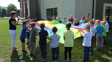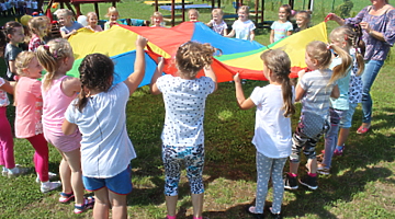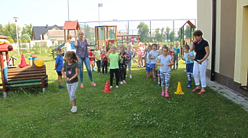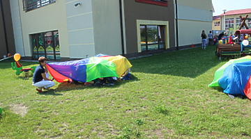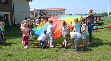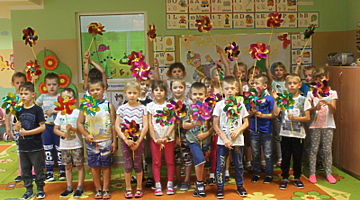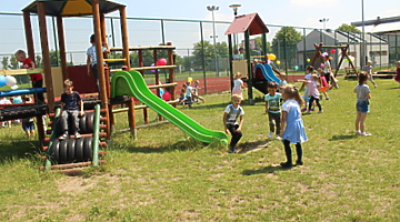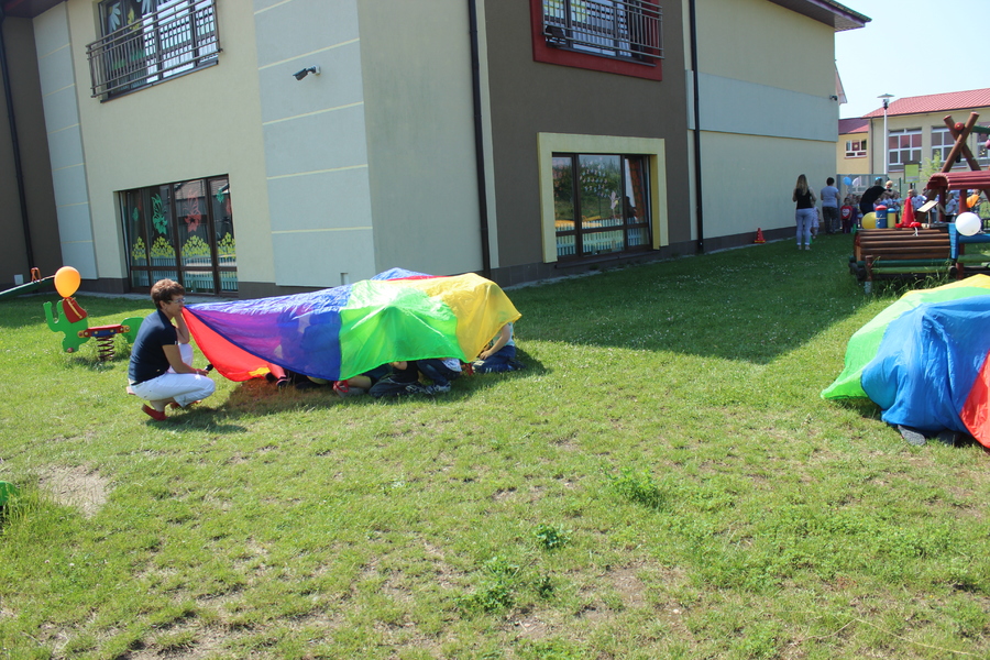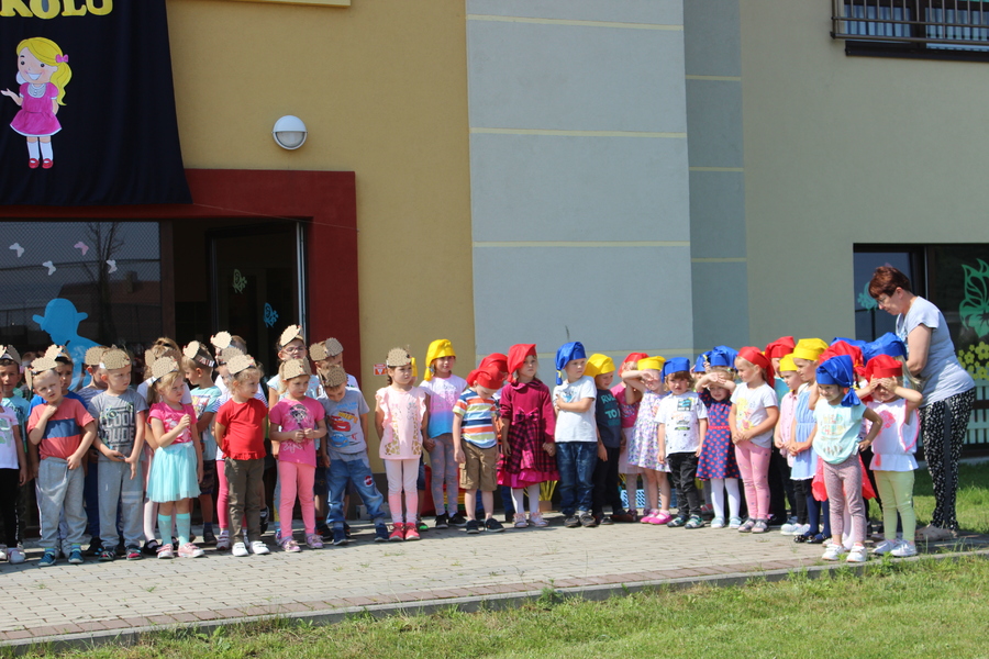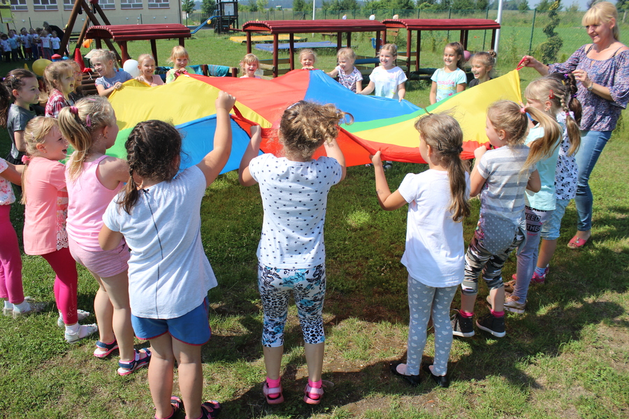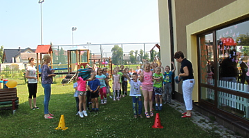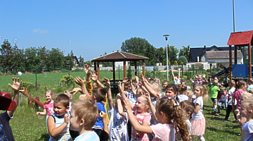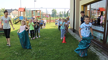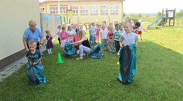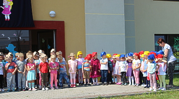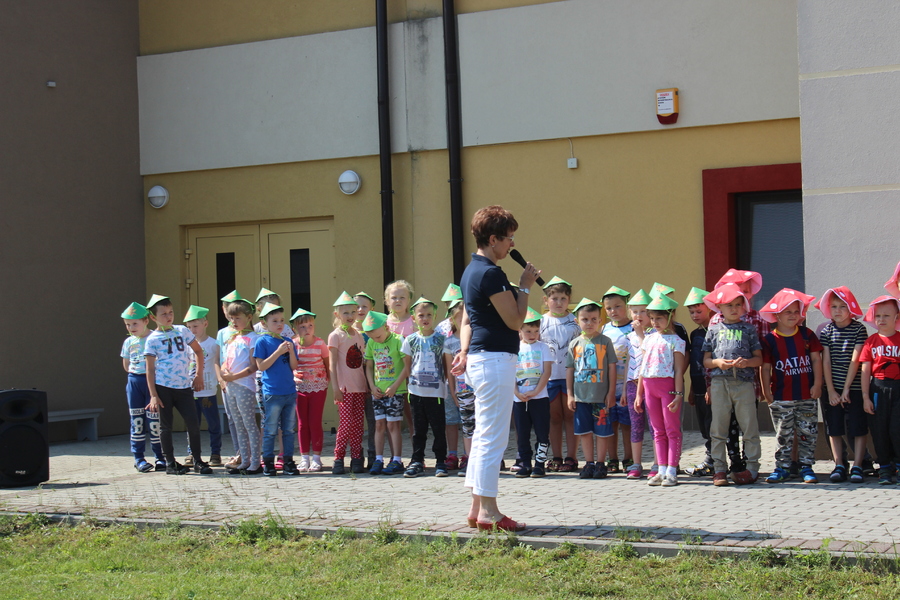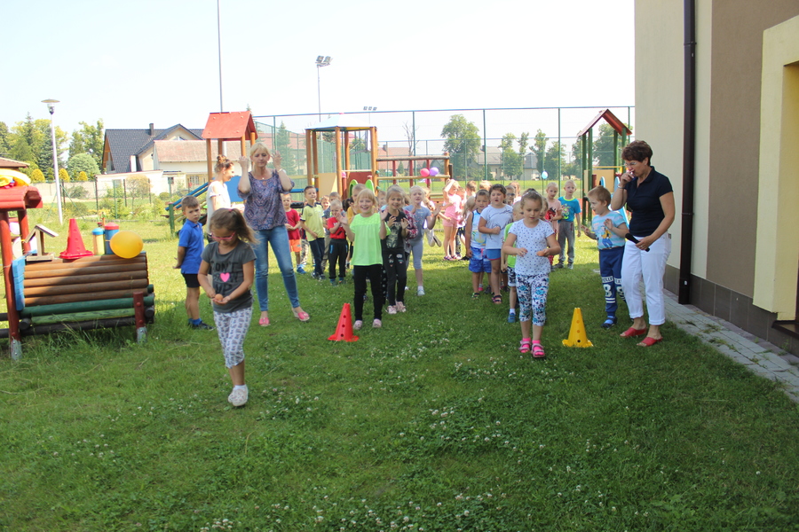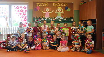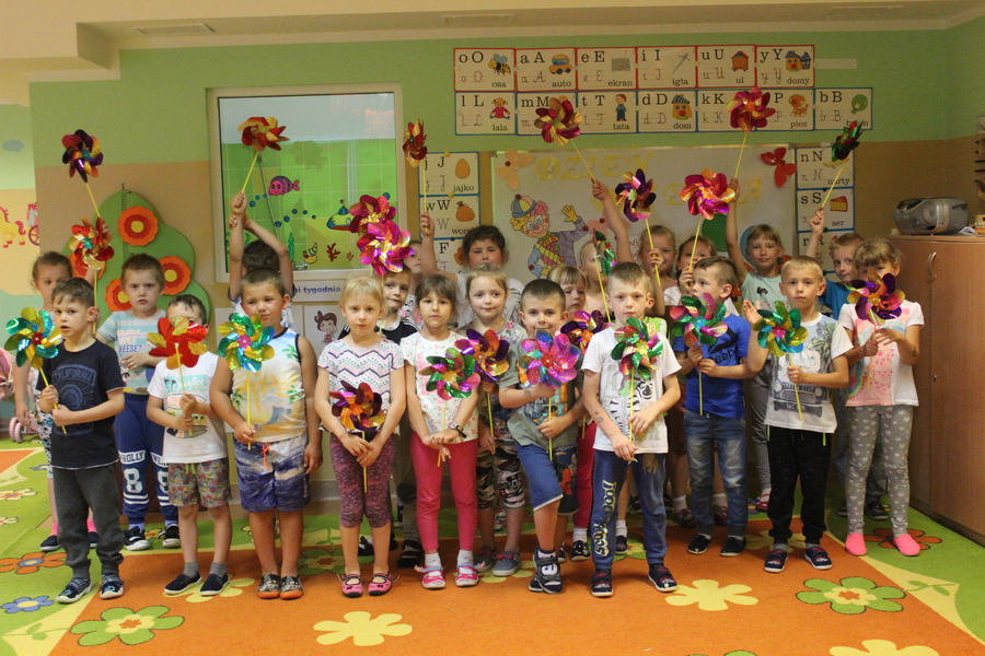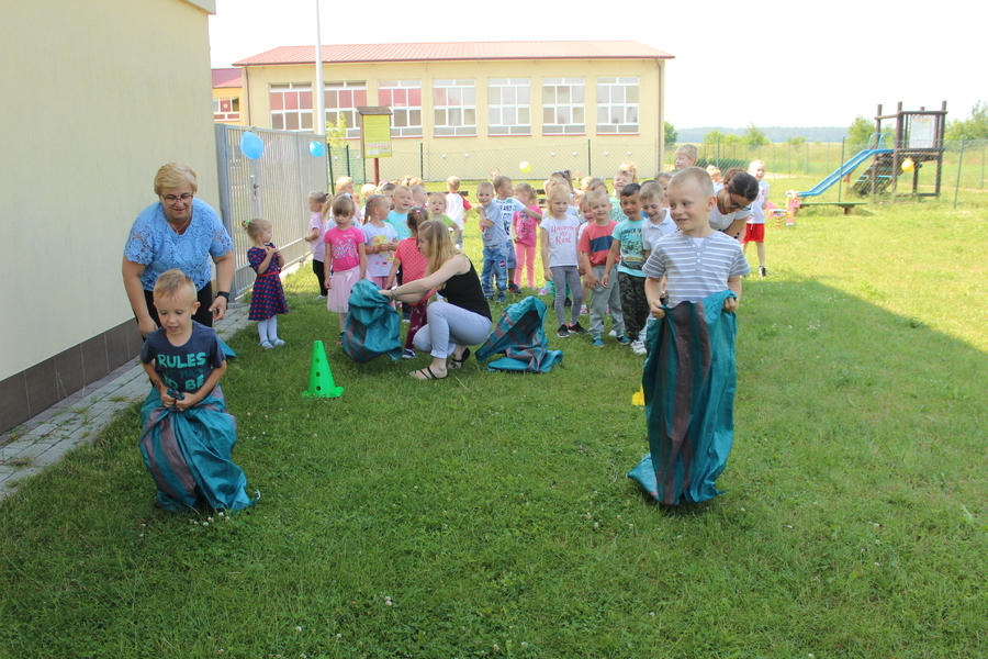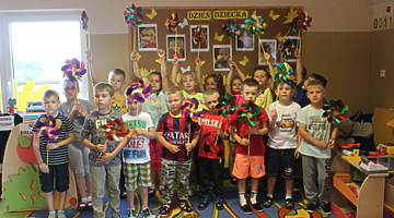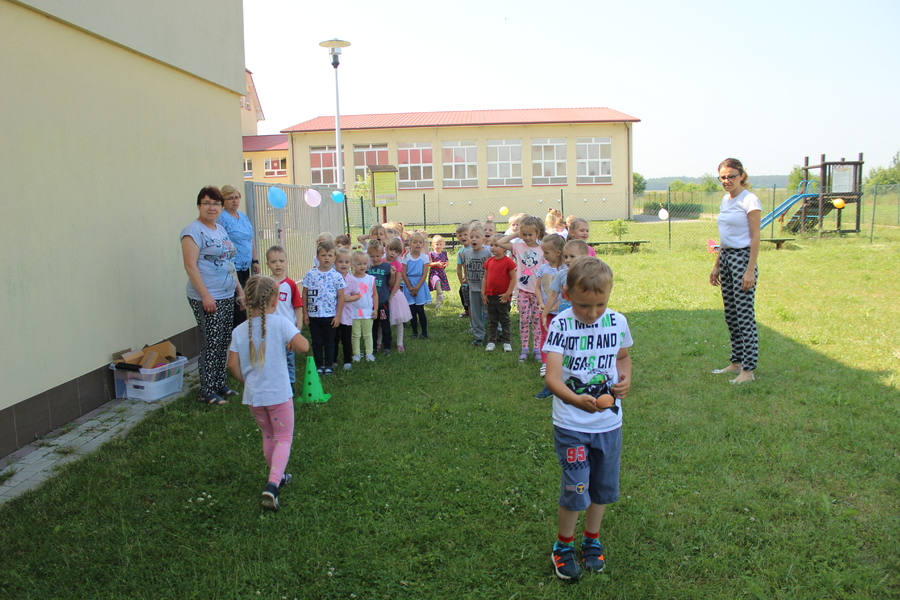 W poniedziałek 4 czerwca w przedszkolu odbył się Dzień Dziecka. Świętowanie polegało na wspólnym spotkaniu się wszystkich grup przedszkolnych na przedszkolnym placu zabaw. Nauczycielki złożyły dzieciom życzenia, przygotowały okolicznościowy transparent i przyozdobiły plac balonami, aby było pięknie i kolorowo, co dzieciom bardzo się podobało. Dzieci rywalizowały w grach i zabawach sportowych między grupami, wśród których były: skoki w workach, bieg z jajkiem na łyżce, zabawy z chustą animacyjną. Oczywiście nie zabrakło wspólnej zabawy przy muzyce, w czasie której włączone były kolorowe bańki, które tańczyły po całym placu wspólnie z dziećmi. Kuchnia przedszkola ufundowała dzieciom lody, a mamy z Rady Rodziców napoje, lizaki oraz każde dziecko do domu wracało z kolorowym wiatraczkiem. Ponadto za wspaniałą zabawę dzieci otrzymały również ordery, z którymi dumnie wracały do domu.