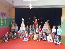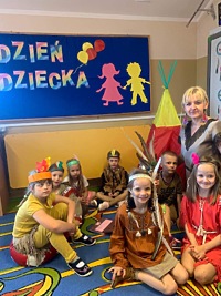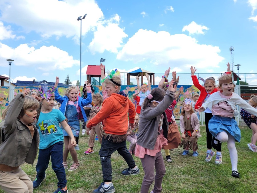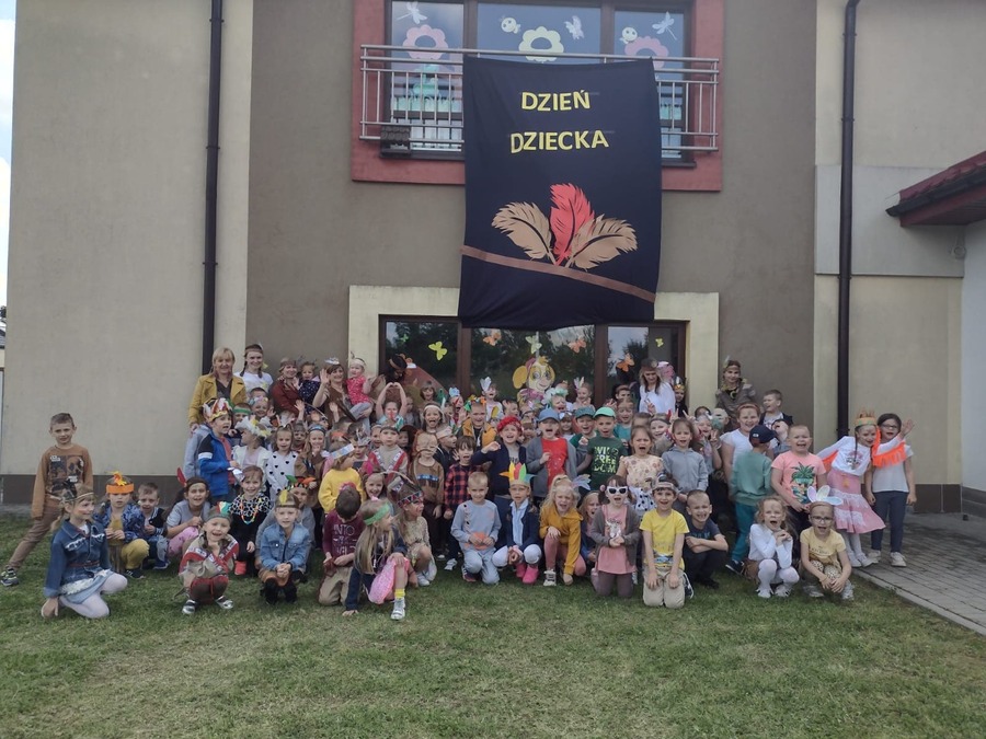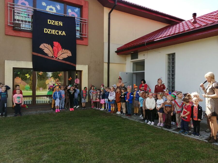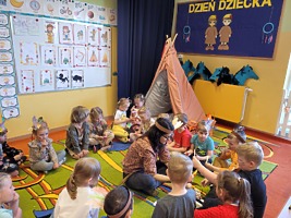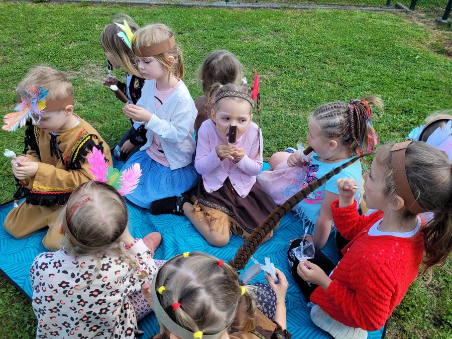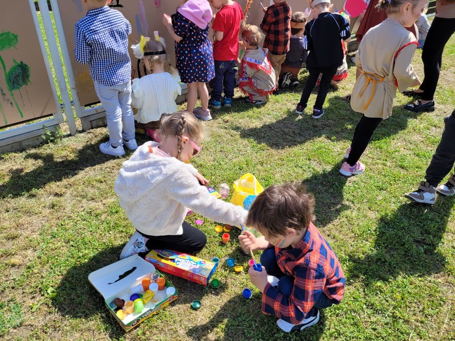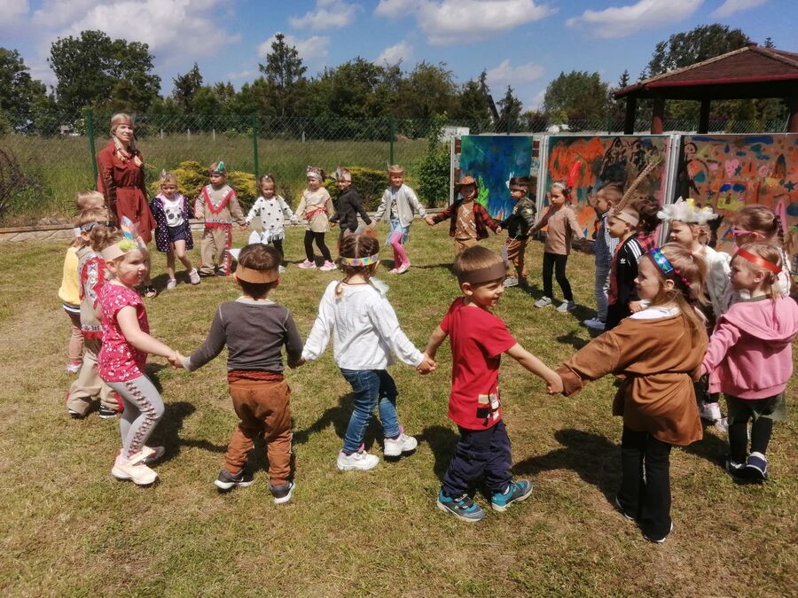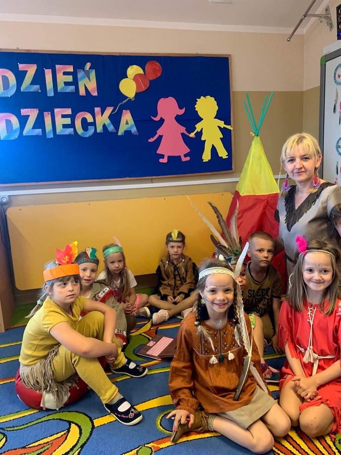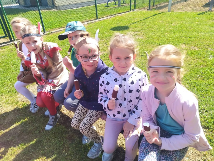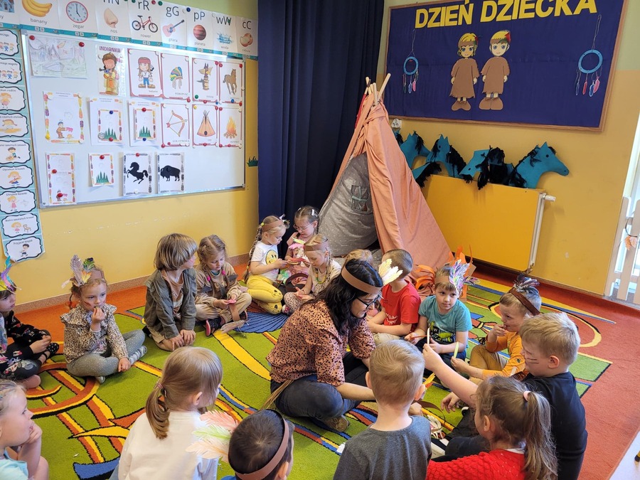 1 czerwca w naszym przedszkolu obchodziliśmy Dzień Dziecka. W tym roku hasłem przewodnim uroczystości była „Indiańska wioska”, a dzieci stały się małymi Indianami. Przedszkolaki uczestniczyły w rozmaitych zabawach, dzięki którym rozwijały aktywność twórczą i rozbudzały ciekawość życiem Indian. Dzieci dowiedziały się, że „Tipi” to rodzaj namiotu Indian Ameryki Północnej oraz nauczyły się okrzyku plemienia Indian. Wykonały własne pióropusze, malowały wspólnie farbami.