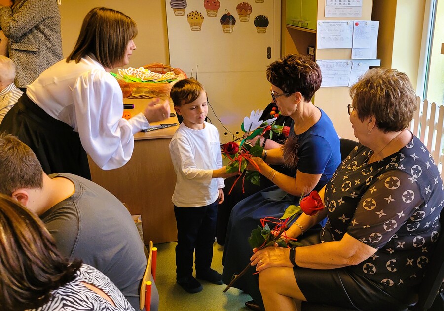 Dzieci z najstarszych grup przedszkolnych zaprezentowały się w części artystycznej, którą dziękowały swoim nauczycielkom, opiekunkom i całemu personelowi przedszkola za ich pracę i oddanie. Z życzeniami dla wszystkich przepięknie zagrała też przedszkolna orkiestra, zachwycając umiejętnościami gry z wykorzystaniem instrumentów perkusyjnych oraz niebywałą rytmiką. Przedszkolaki przygotowywały swój program pod kierunkiem pani Anety Jędrycy oraz pani Małgorzaty Woźniak.