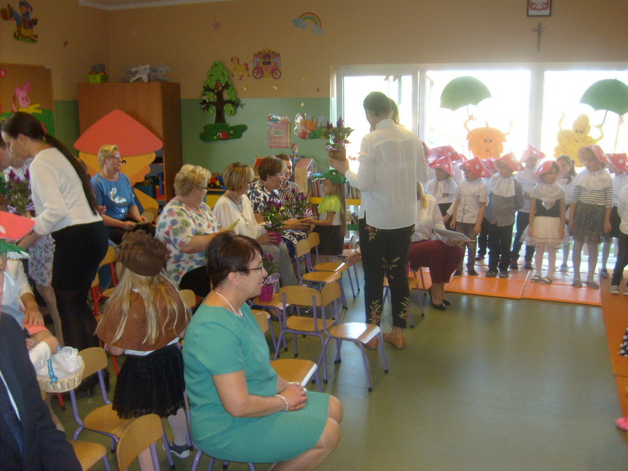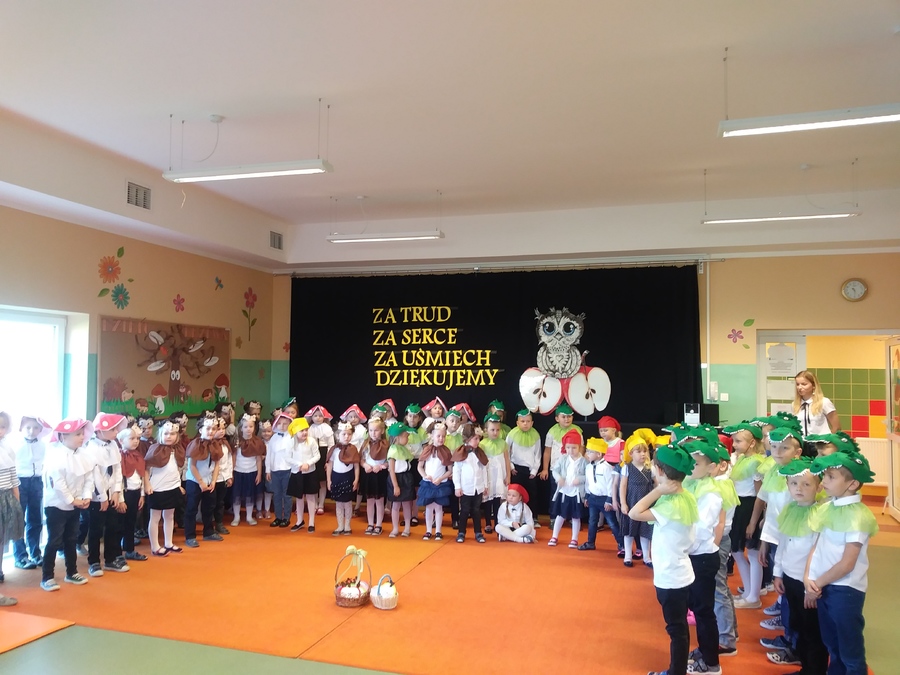 Na zakończenie dzieci rozdały wszystkim obecnym na uroczystości własnoręcznie wykonane, kolorowe jabłuszka. Goście gratulowali dzieciom pięknych występów i przekazywali życzenia.