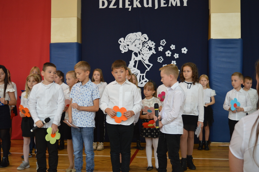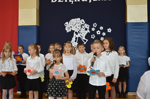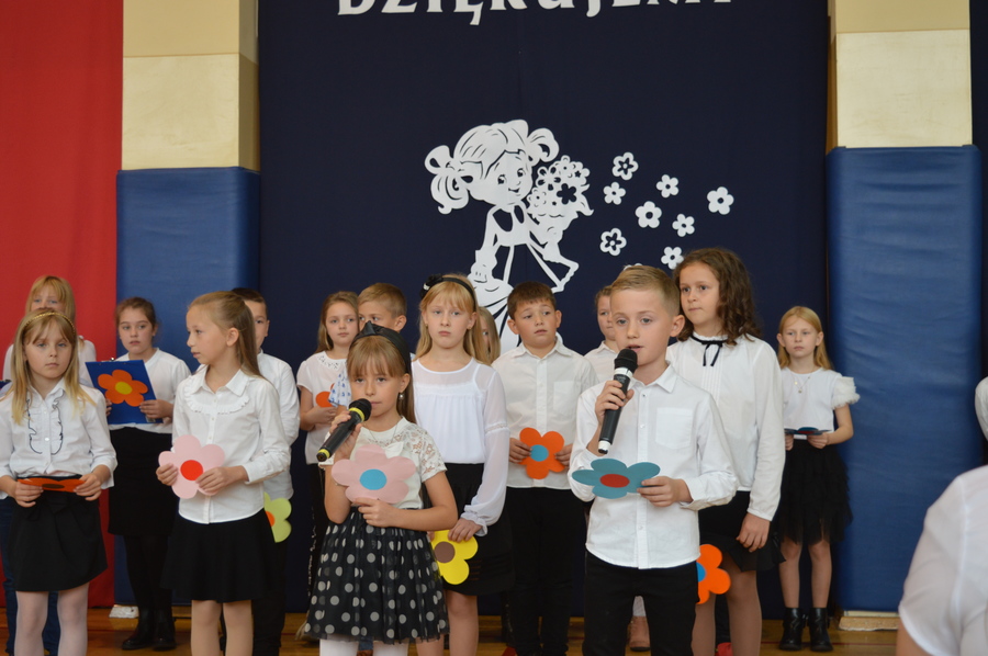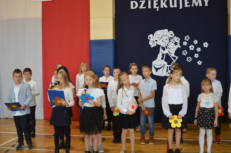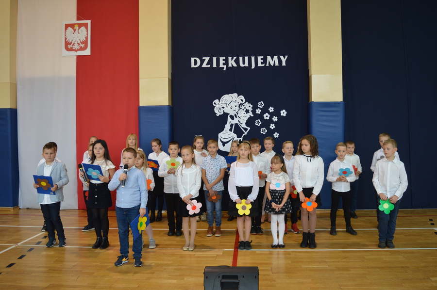 Trzecioklasiści, dla których był to pierwszy publiczny występ, bardzo się postarali. Przybliżyli historię święta, zaprezentowali piosenki i żartobliwe wierszyki, złożyli życzenia nauczycielom i wszystkim pracownikom szkoły.