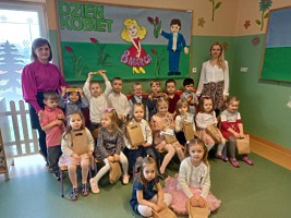 8 marca w naszym przedszkolu obchodziliśmy „Dzień Kobiet”. Radosna atmosfera panowała już od samego rana. Chłopcy złożyli paniom i koleżankom życzenia, tradycyjnie zaśpiewali uroczyste „100 lat”, a wszystkie kobietki otrzymały upominki. Święto Kobiet, które corocznie obchodzimy w naszym przedszkolu, to doskonały sposób do kształtowania u dzieci nawyku obdarowywania drobnymi upominkami swoich najbliższych.