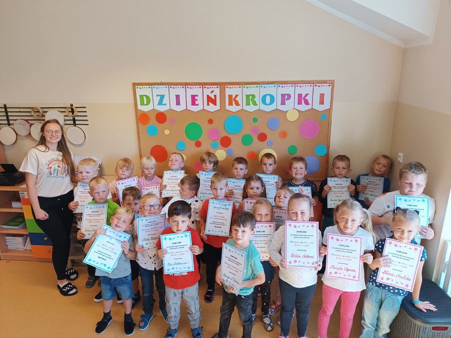 Dzieci miały okazję poznać krótką genezę powstania tego nietypowego święta. Uczestniczyły w kropkowych zabawach ruchowych i plastycznych ,miały okazję fotografować się w „Kropkowej fotobudce”. Po dniu pełnym kropkowych zadań opuszczały przedszkole z dyplomem za udział w kreatywnych zajęciach z okazji Międzynarodowego Dnia Kropki.