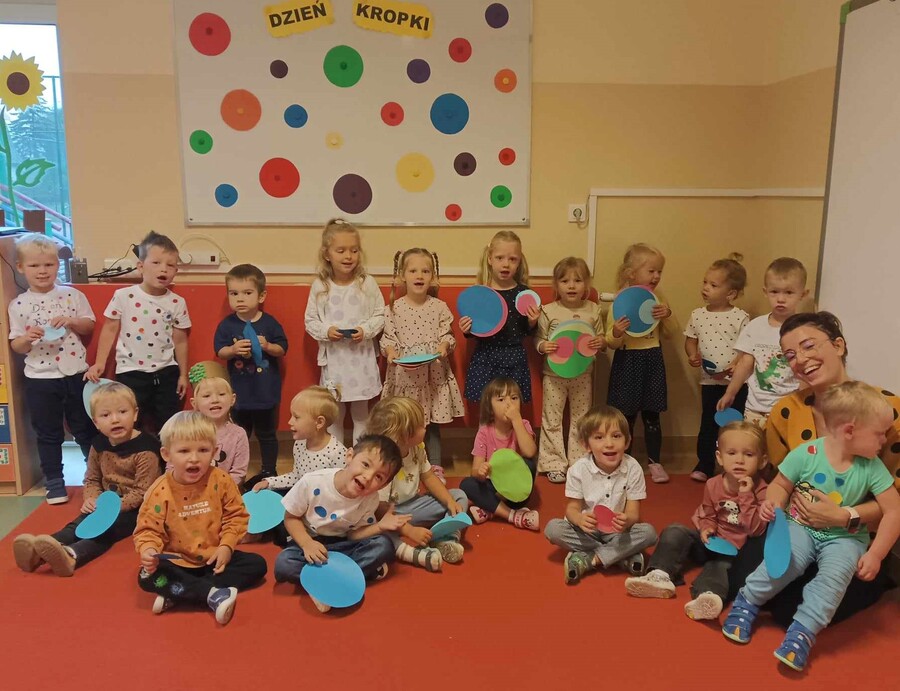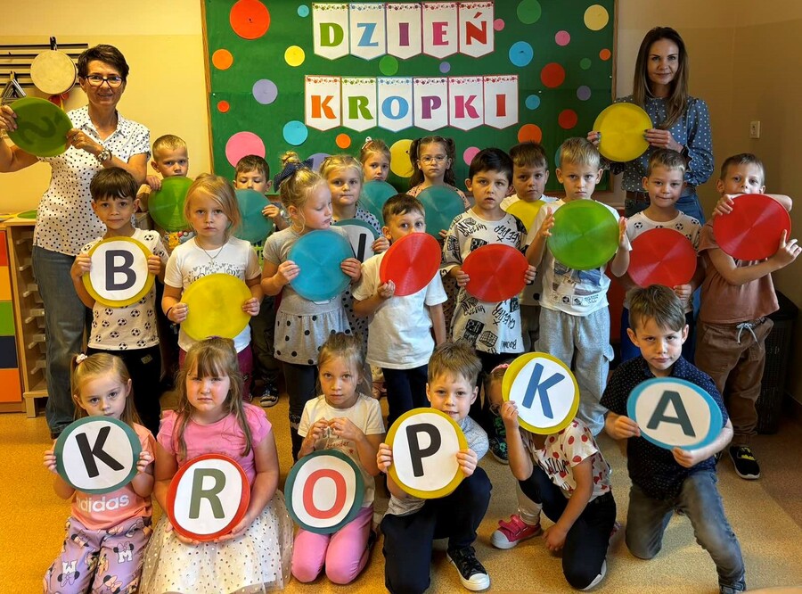 13 września w naszym przedszkolu świętowaliśmy Dzień Kropki. Kropkowe akcenty widoczne były w ubiorze dzieci, a w salach zabaw towarzyszyła wszystkim kropkowa sceneria. Zajęcia i zabawy wszystkich przedszkolaków sprowadzały się do szukania, malowania, wycinania i tworzenia kropki jako głównej bohaterki dnia. W przeżywaniu dzisiejszego dnia pomogła również deszczowa pogoda, która sprawiła, że wodne kropki pojawiły tę także na szybach okien.