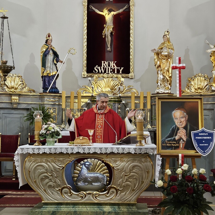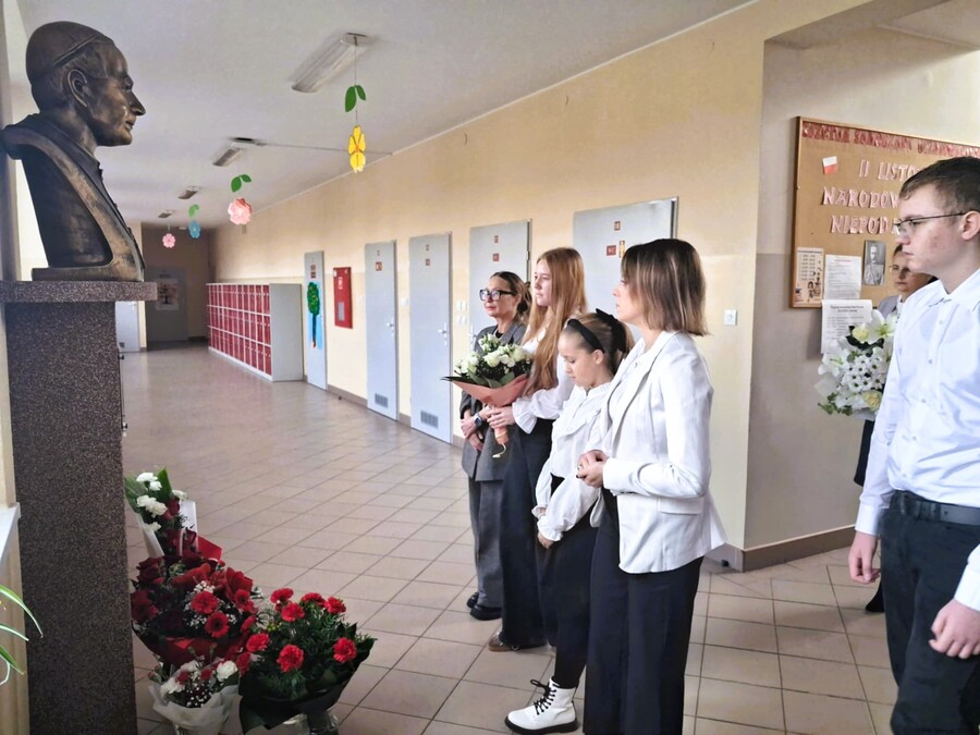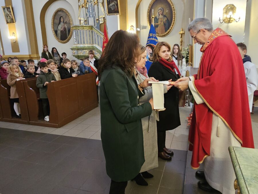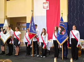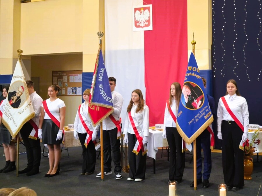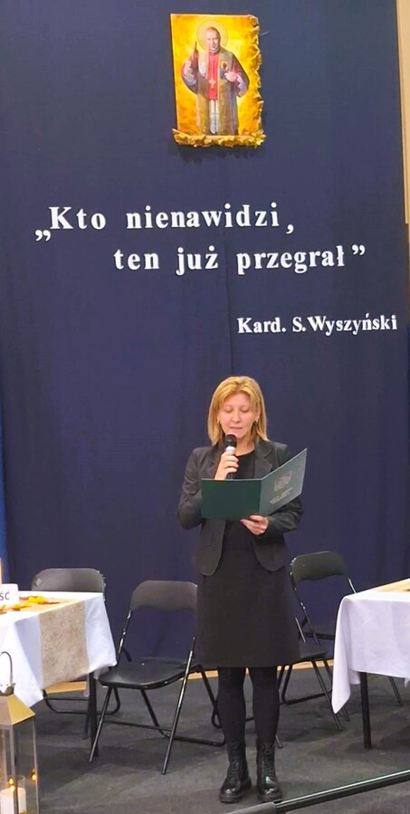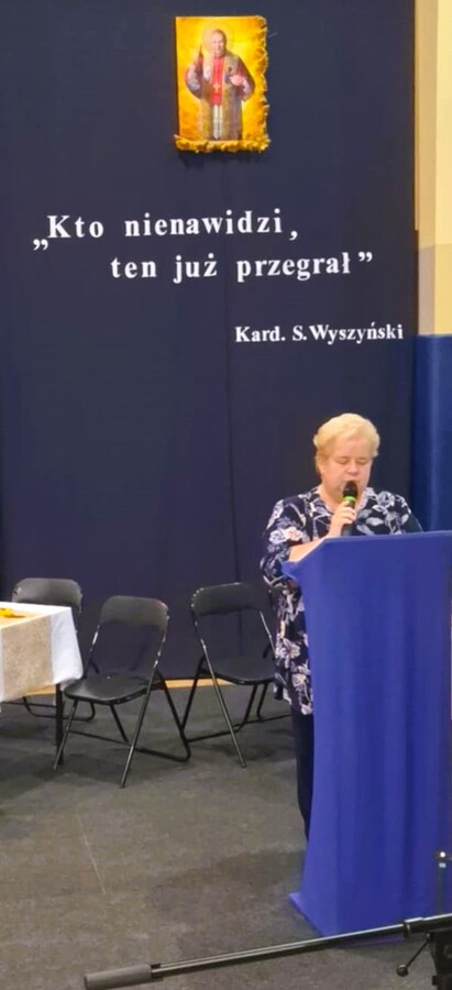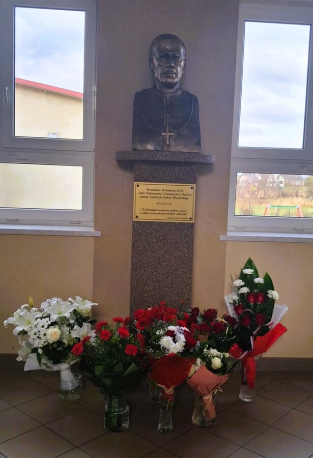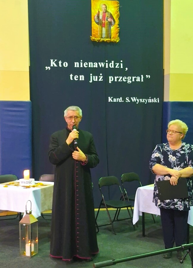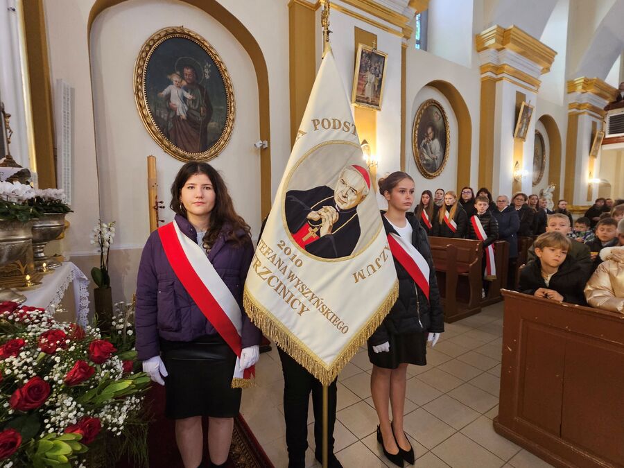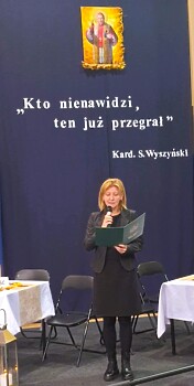 Dalsza część uroczystości była kontynuowana w szkole, gdzie dyrektor szkoły pani Ewa Hetmańczyk przywitała przybyłych gości oraz złożyła życzenia wszystkim zgromadzonym z okazji obchodzonego święta. Dyrektor szkoły odniosła się również do postaci Patrona naszej szkoły i wartości jakimi kierował się w życiu oraz podsumowała działania związane bł. Kard. Stefanem Wyszyńskim , które podejmowaliśmy w minionym roku.