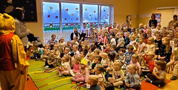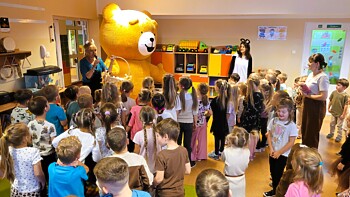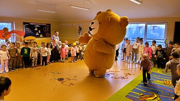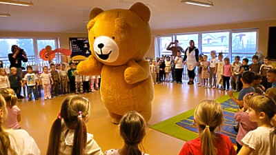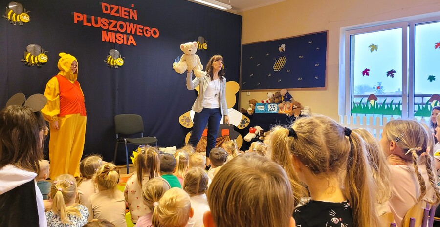 W „misiowe” zajęcia włączyła się również pani Ewa Gaze, odwiedziła dzieci przedszkolne w towarzystwie „Kubusia Puchatka”. Podczas spotkania z dziećmi goszcząca w przedszkolu nauczycielka bibliotekarka przeniosła wszystkich do świata misiowych przygód w czasie czytania bajki. Wydarzenie uatrakcyjniła piosenka z zabawą ruchową.