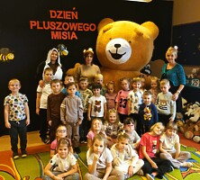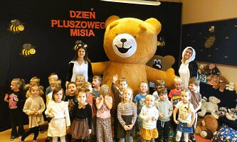 Dodatkową, wspaniałą atrakcją dzisiejszego świętowania były odwiedziny olbrzymiego, tańczącego MISIA, o co zadbała Rada Rodziców Przedszkola. Zaangażowane mamy upominki dla przedszkolaków oraz ściankę na przedszkolnym holu. Misiowy dzień dobiegł końca. W pamięci przedszkolaków zostaną ciepłe uśmiechy, wspólne zabawy i pluszowe przytulanki. Wychowawczynie grup przedszkolnych składają podziękowania pani Ewie Gaze i Radzie Rodziców za uatrakcyjnienie tego dnia.