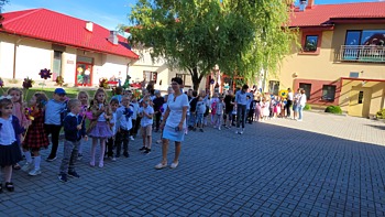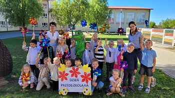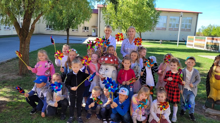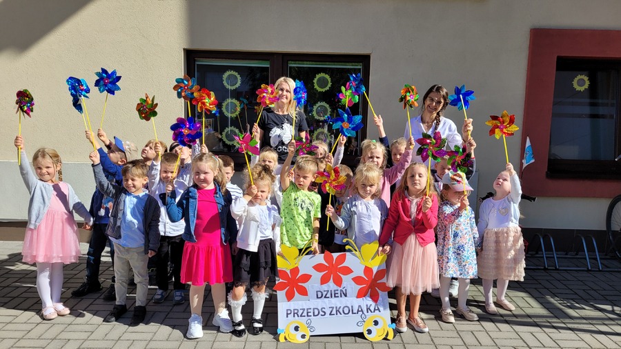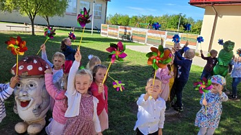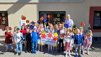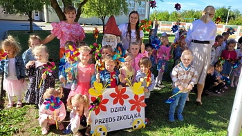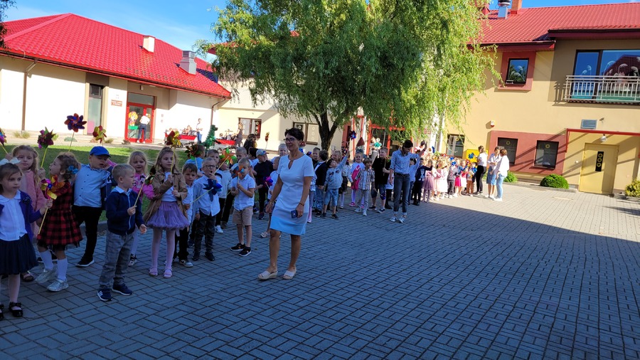 Obchody naszego przedszkolnego święta przeniosły się również na najbliższą okolicę. W czasie wspólnego spaceru, barwny korowód przedszkolaków, zaopatrzony w wiatraczki ufundowane przez Radę Rodziców ogłaszał wszystkim radosny czas świętowania.