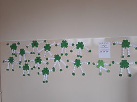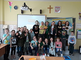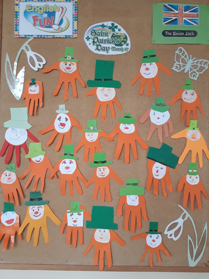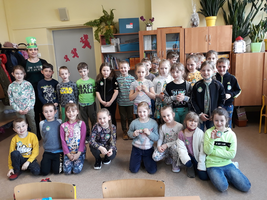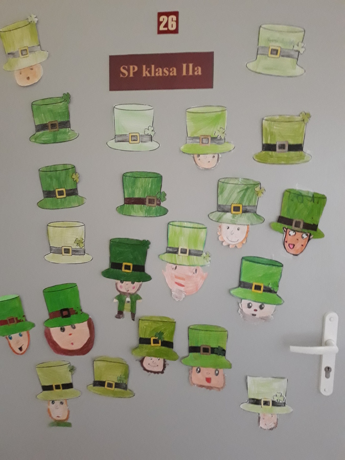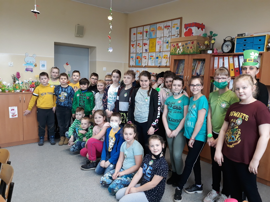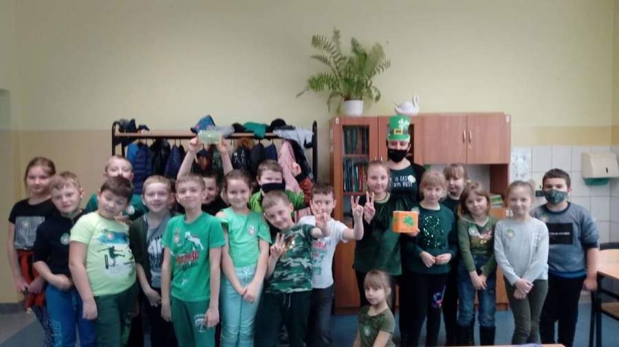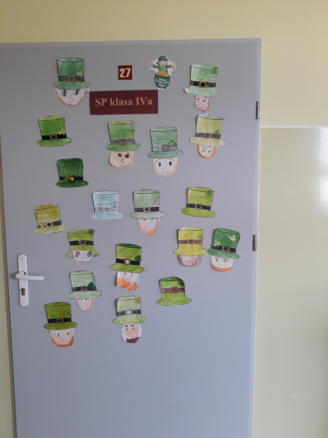 17 marca 2021r. w naszej szkole zrobiło się bardzo, bardzo zielono. W nieco zmienionej formie obchodziliśmy Dzień Św. Patryka. Wielu uczniów i nauczycieli włączyło się do zabawy i włożyło tego dnia coś zielonego. Po szkole spacerował Leprechaun rozdając, każdemu kogo spotkał, magiczne medaliony na szczęście. Uczniowie klas I-III poznali elementy kultury i tradycji Irlandii, dowiedzieli się, kim był św. Patryk i jak obchodzi się jego święto w krajach anglojęzycznych. Wykonali wiele ciekawych prac, którymi ozdobione zostały drzwi klas oraz korytarze w ich pobliżu. Były to między innymi kapelusze Leprikona, koniczynki oraz garnek wypełniony monetami, na których uczniowie klasy III zapisali, co jest dla nich największym skarbem.