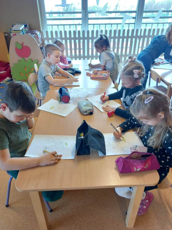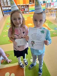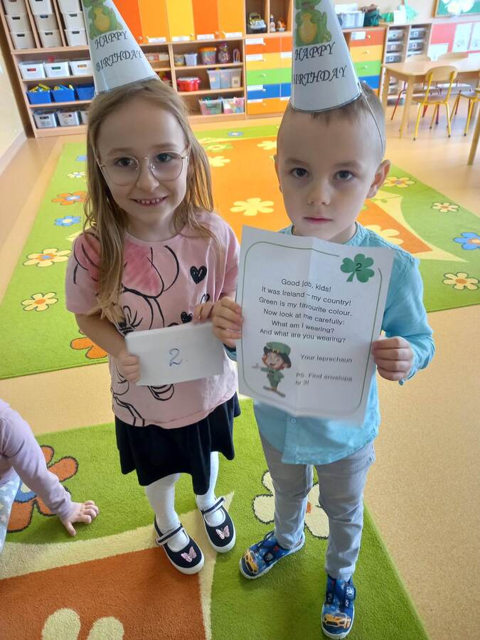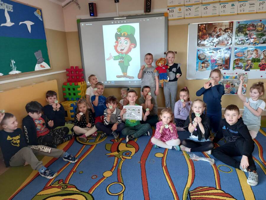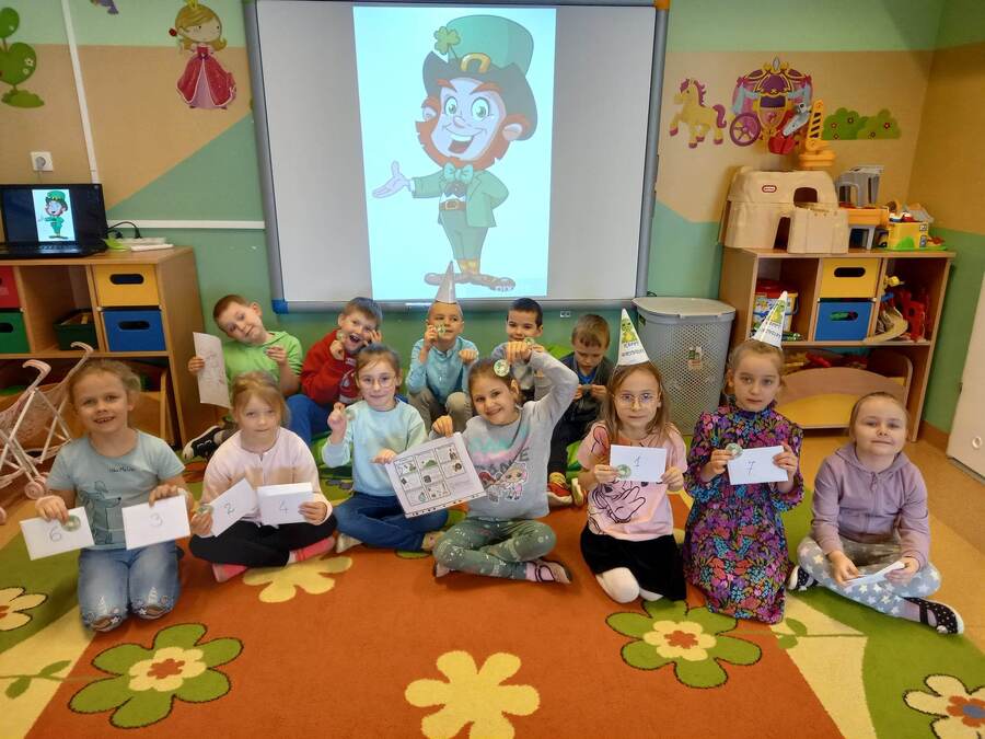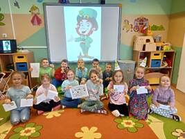 Oddziały przedszkolne na swój sposób brały udział w obchodach Dnia Świętego Patryka. Dzieci wysłuchały ciekawostek o Irlandii, kolorowały Leprechauna – skrzata oraz zatańczyły do piosenki o Świętym Patryku w wersji angielskiej. Na pamiątkę każdy otrzymał medal przedstawiający Leprechauna.