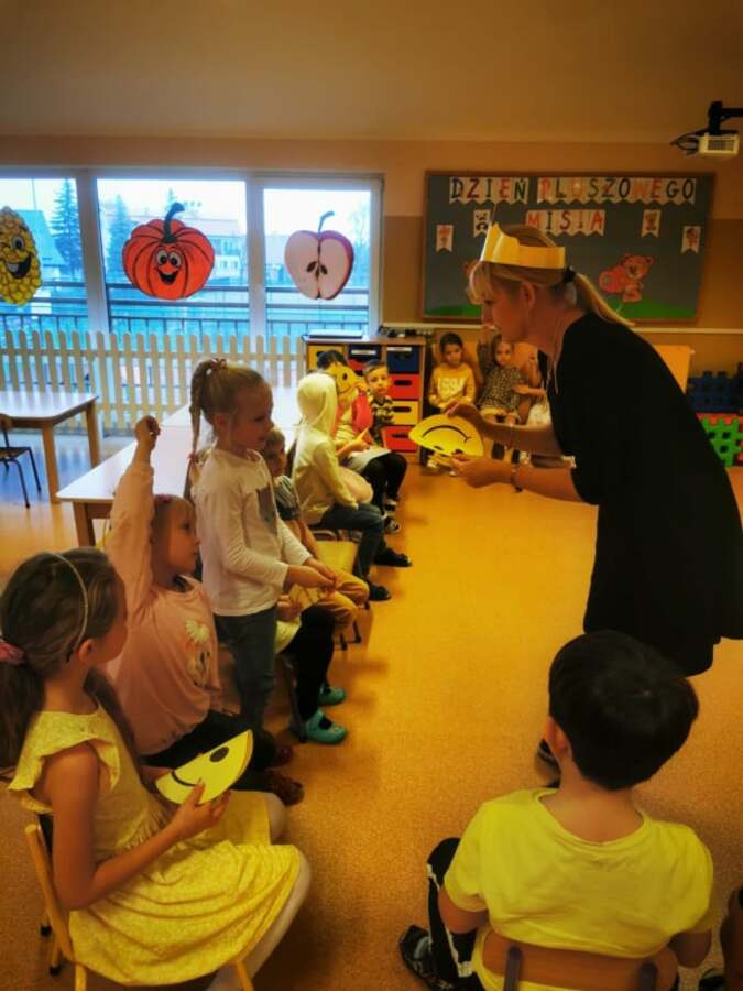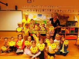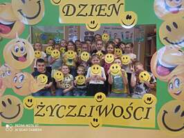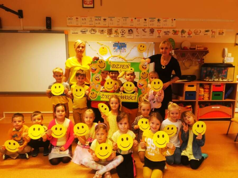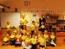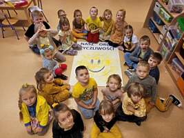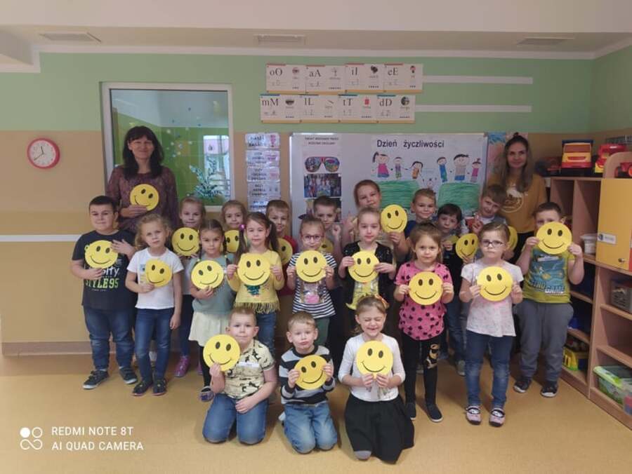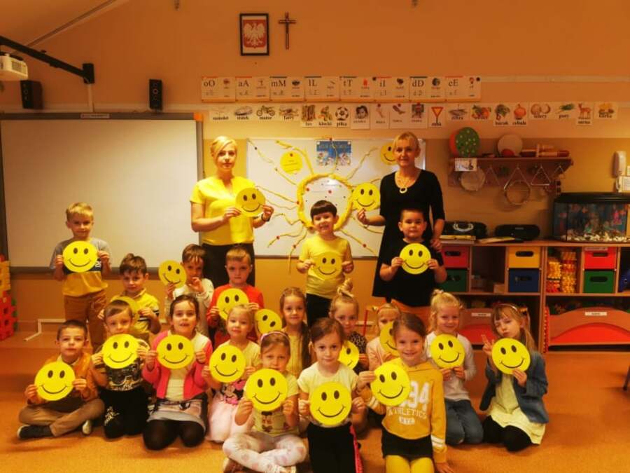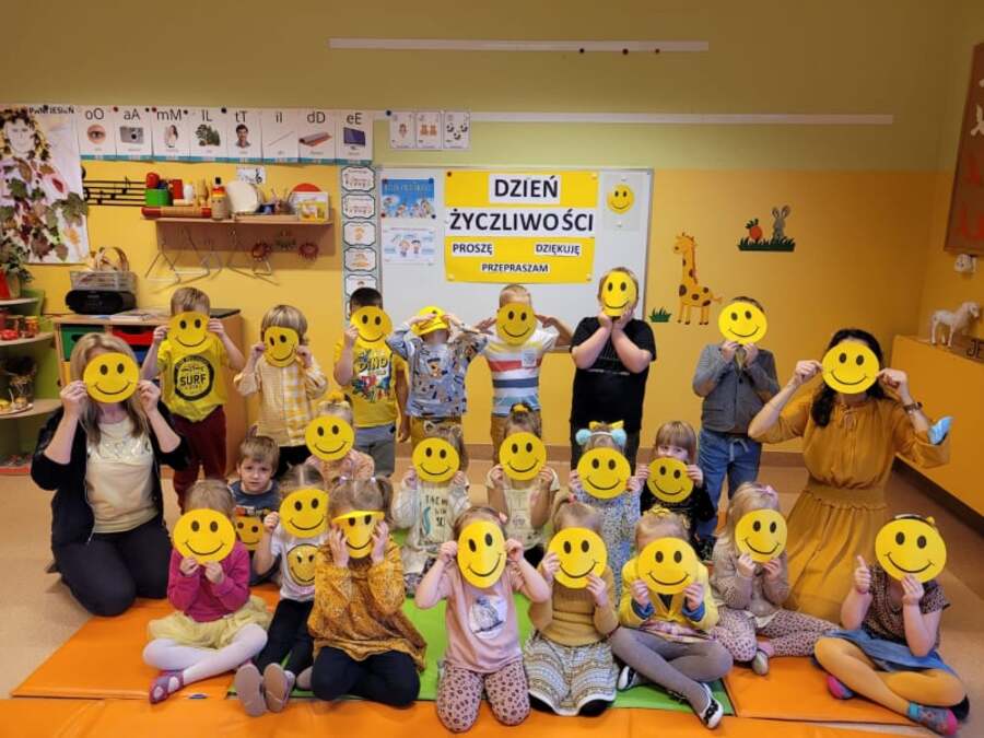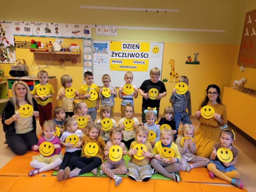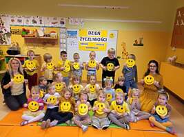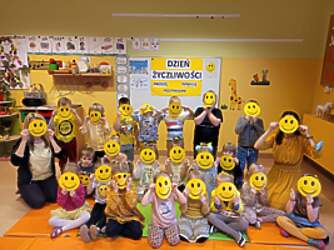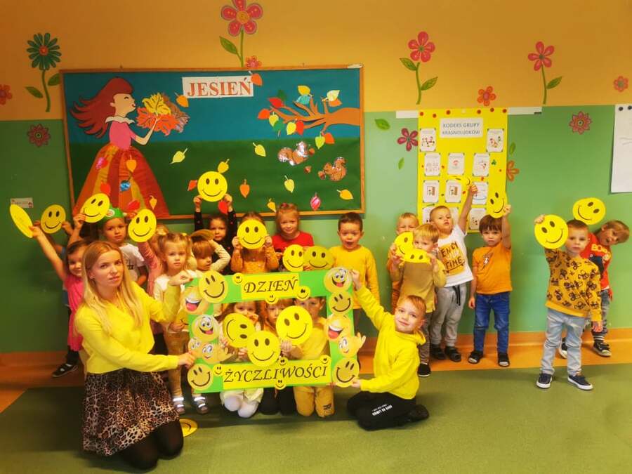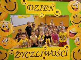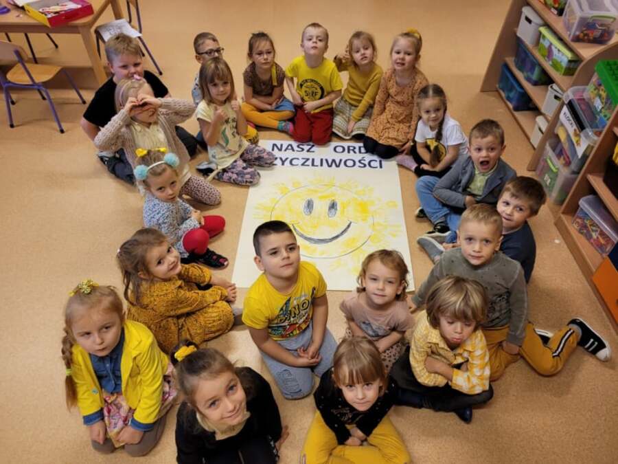 22 listopada w naszym przedszkolu zorganizowaliśmy „Dzień życzliwości”. Kolorem przewodnim był kolor żółty, który symbolizuje słońce. Słońce to: ciepło, radość, pogoda ducha, uśmiech, a człowiek życzliwy jest taki właśnie ciepły, radosny, pogodny, uśmiechnięty. Dzieci w swoich salach poznawały cechy ludzi życzliwych, wykonywały chmurki, buźki, słoneczka, otrzymały ordery życzliwości. Podsumowaniem wszystkich działań były grupowe zdjęcia.
