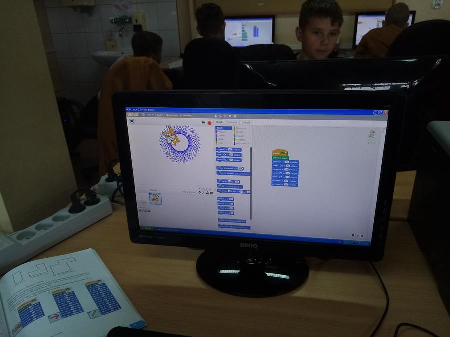 Pierwsza część zajęć obejmowała programowanie obrazkowe w środowisku Scratch. Uczniowie uczyli się programować postacie na ekranie komputera w taki sposób, aby podczas poruszania się pozostawiały za sobą ślad, a w wyniku wykonania całego skryptu na ekranie powstał rysunek przedstawiający konkretny – zaplanowany wcześniej kształt. Na początku zaprogramowanie, prostego z pozoru rysunku, sprawiało uczestnikom wiele problemów i niejeden stwierdził, że o wiele łatwiej to wykonać za pomocą linijki i ołówka na kartce papieru. Jednak pod koniec zajęć powstawały już bardzo ładne rysunki, a zabawa była coraz fajniejsza.
