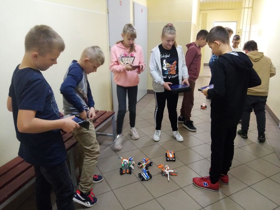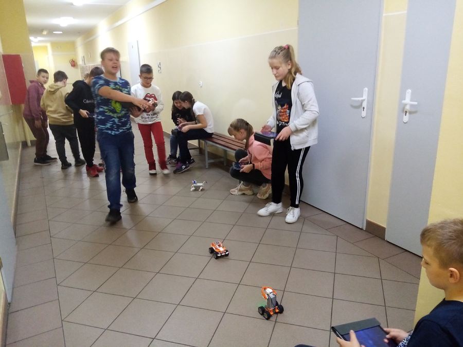 Druga część zajęć dotyczyła robotyki. W klasie 4 uczniowie otrzymali różne modele robocików Apitor Super Bot. Zapoznali się z aplikacją umożliwiającą budowę, programowanie i sterowanie tymi robocikami. Następnie zgłębili technologię wprawiania materii w ruch: robociki jeździły, tańczyły, migały światełkami, co sprawiło młodym konstruktorom wiele radości.