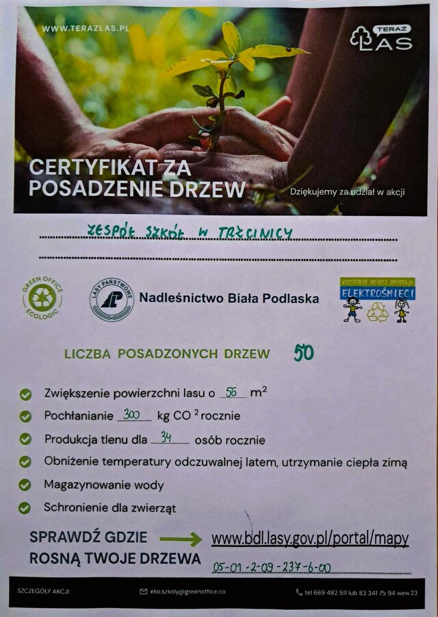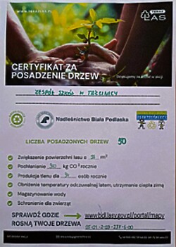 To, że wspólnymi siłami pomogliśmy w sprawnym i ekologicznym pozbyciu się urządzeń elektrycznych to nie wszystko. Właśnie otrzymaliśmy certyfikat zapewniający nas (zgodnie z umową) o nasadzeniu w naszym imieniu 50 drzew, co zwiększyło powierzchnię lasu o 56 m2. Taka ilość drzew w przyszłości może rocznie wyprodukować tlen dla 34 osób i pochłonąć 300 kg CO2