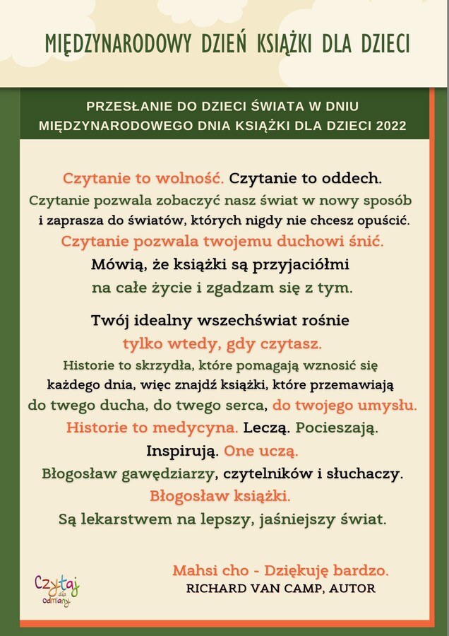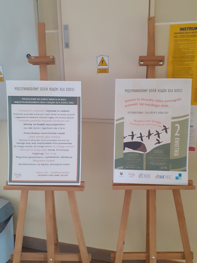 2 kwietnia przypadał Międzynarodowy Dzień Książki dla Dzieci – święto obchodzone na całym świecie w dzień urodzin duńskiego baśniopisarza Hansa Christiana Andersena. Dzień ten ma na celu upowszechnianie książek dla dzieci oraz wspieranie czytania przez najmłodszych. Biblioteka szkolna włączyła się w obchody tego święta. Ze względu na to, że 2 kwietnia przypadał w sobotę w naszej szkole obchodziliśmy to święto w piątek 1 kwietnia. W tym dniu na każdej przerwie śródlekcyjnej bibliotekarka szkolna Ewa Gaze czytała bajki najmłodszym uczniom. W holu szkoły można było obejrzeć wystawę promującą to święto. Międzynarodowy Dzień Książki dla Dzieci był kolejną okazją do tego, by zachęcić uczniów do częstych kontaktów z biblioteką, jak również rozbudzić w nich zainteresowanie książką i czytaniem.