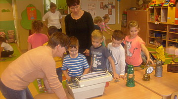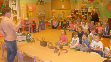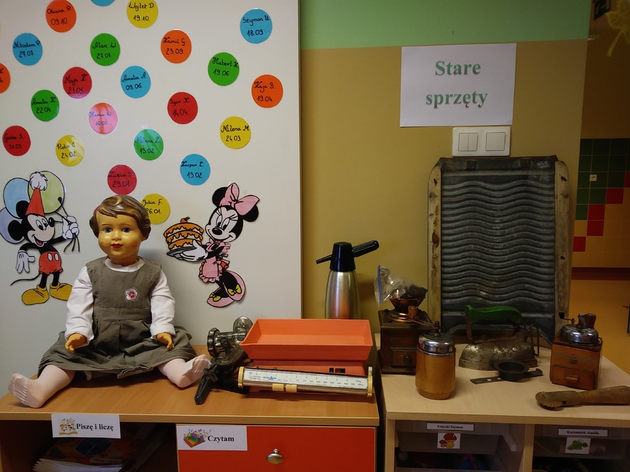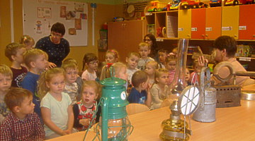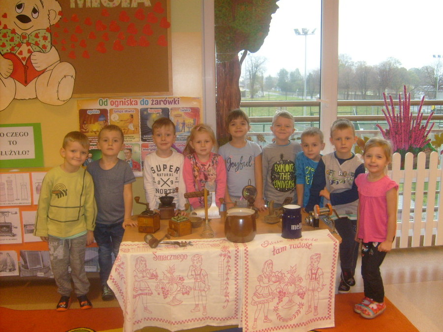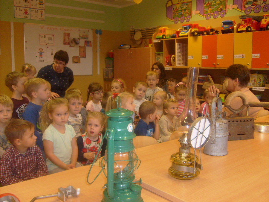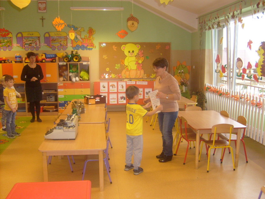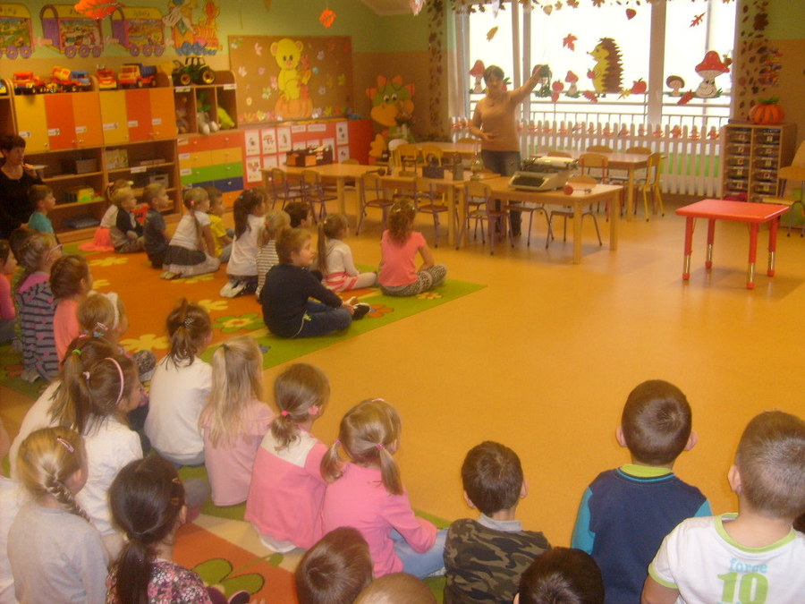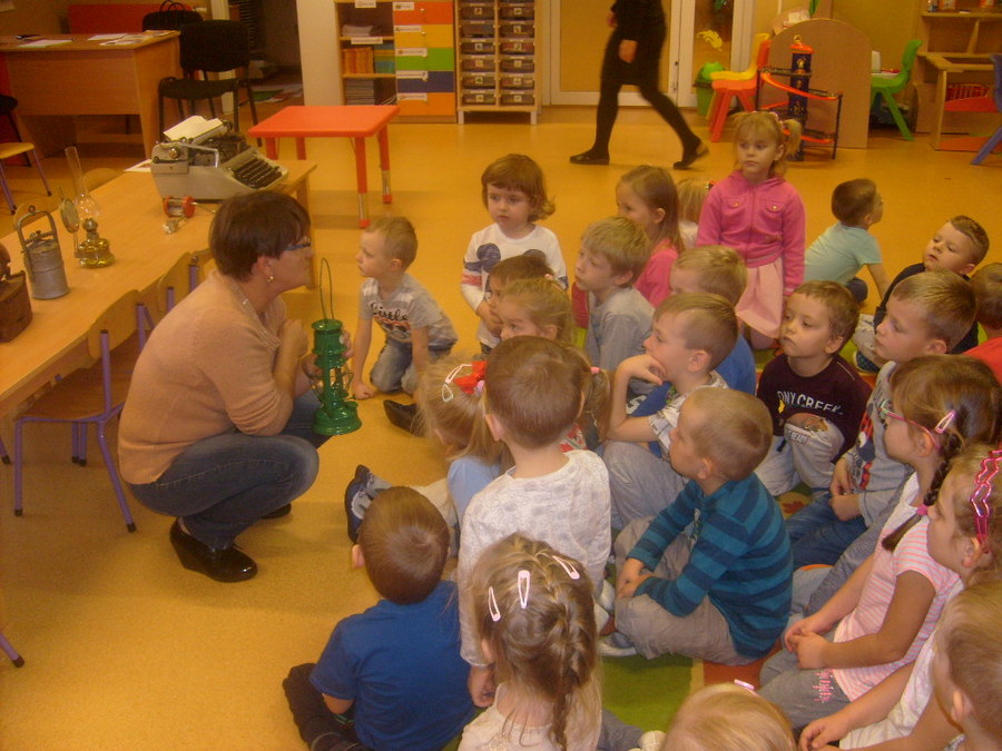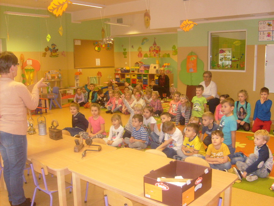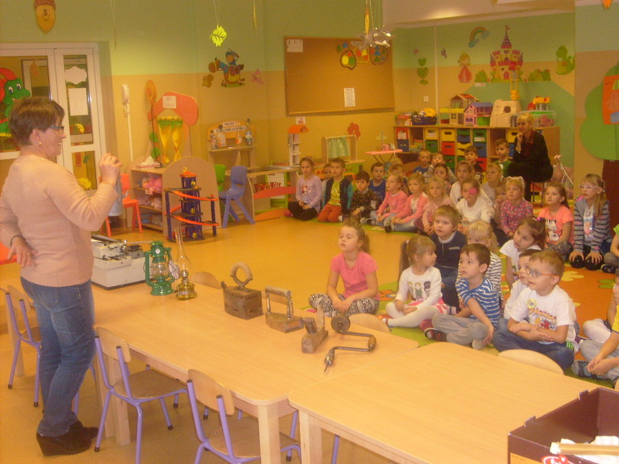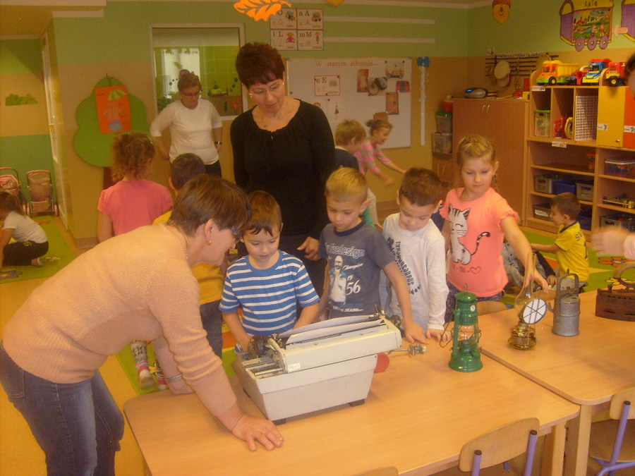 Realizując tematykę związaną ze starymi sprzętami, którymi pracowali nasi dziadkowie i babcie dnia 6 listopada 2017r. gościliśmy w przedszkolu Panią Annę Jerzyk (babcię jednego z przedszkolaków), która przybyła do nas z takimi urządzeniami jak: maszyna do pisania, „żelazko z duszą”, żelazko do nagrzewania, ręczna wiertarka, strug, lampa naftowa, lampa karbidowa, ręczna maszynka do robienia makaronu. Ciekawie opowiadała i demonstrowała przeznaczenie tych sprzętów. Najpierw najstarszym grupom, a później młodszym. Przedszkolaki miały możliwość popróbować pisania na maszynie, czy pokręcić ręczną wiertarką i poczuć zapach drewna, dotknąć powstałe wióry po pracy strugiem. Całość spotkania odbywała się w sali „Smoki Dinusie”, w której to powstał również kącik starych sprzętów zorganizowany przez dzieci z udziałem rodziców. Znalazły się tam stare sprzęty takie jak: tara do prania, młynki do mielenia, waga, syfon do robienia wody gazowanej i wiele innych, których dzieci wcześniej nie widziały. Ogromnym zainteresowaniem cieszyła się lala, która ma co najmniej 50 lat.
