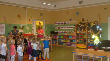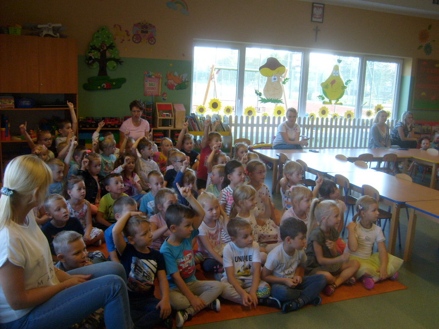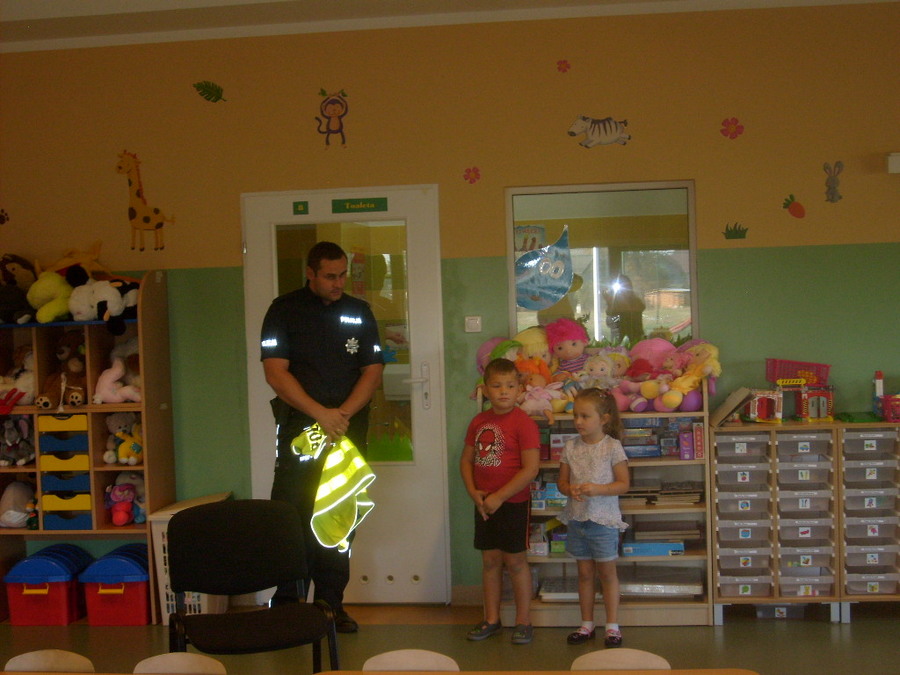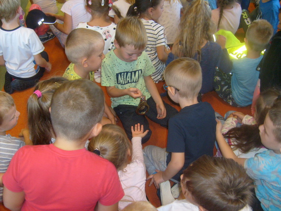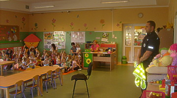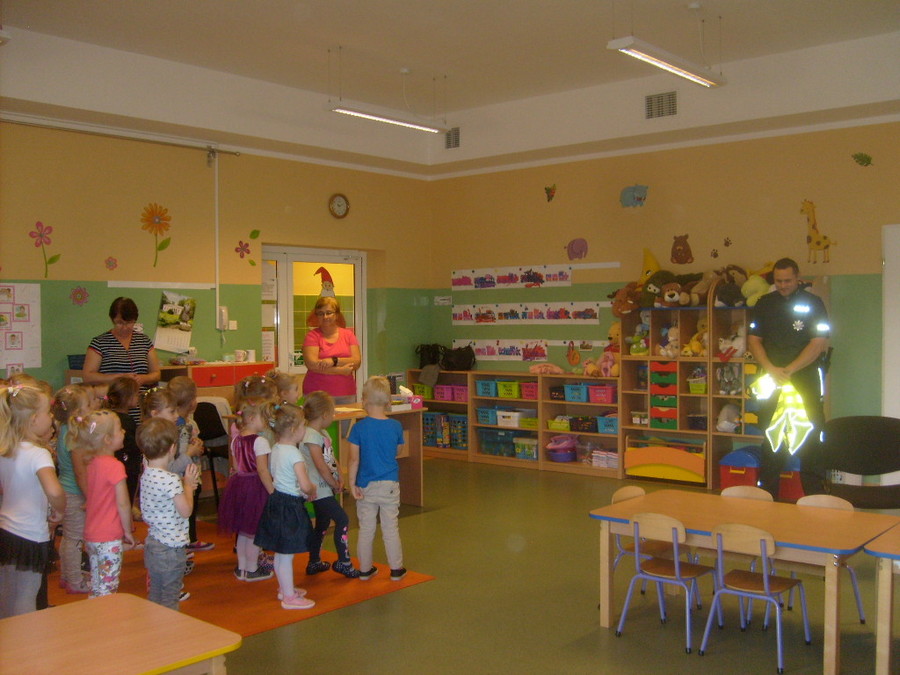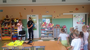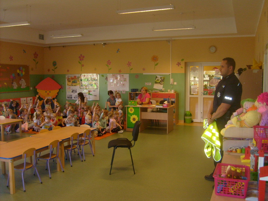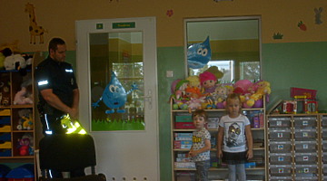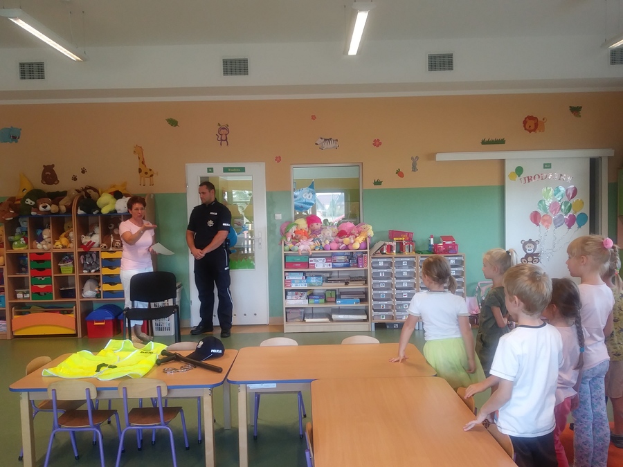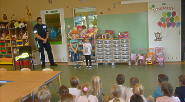 Początek roku szkolnego w przedszkolu, to wdrożenie dzieci do zgodnej i bezpiecznej zabawy nie tylko w sali przedszkolnej. O bezpieczeństwie należy pamiętać w czasie spacerów i wycieczek przedszkolaków jak i na placu zabaw. Dopełnieniem wiedzy na ten temat było spotkanie z policjantem, starszym szeregowym Pawłem Balcerzakiem, który odwiedził nasze przedszkole 18 września 2018r. Dzieci z zainteresowaniem słuchały naszego gościa i oglądały charakterystyczne elementy jego stroju i wyposażenia. Ciekawość wzbudził mundur, czapka i oczywiście kajdanki. Spotkanie przebiegło w milej atmosferze. Dzieci szybko nawiązały dialog z policjantem. Nie było to trudne, bo pan Paweł znał wielu kolegów z grupy syna i oni też mieli większą śmiałość do gościa. Zadawali pytania i chętnie odpowiadali na pytania policjanta.