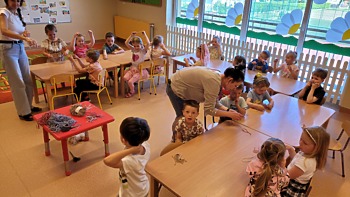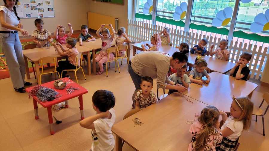 15 maja dzieci z grupy „Jeżyki” odwiedziła mama jednego z przedszkolaków, która spotkanie z dziećmi rozpoczęła od przeczytania bajki „Kicia Kocia”. Pani Karolina nie tylko przeniosła dzieci w świat bajek, ale również zaprezentowała swoje hobby, którym jest „Makrama”. Zajęcia szybko przerodziły się w warsztaty, gdy tylko przedszkolaki otrzymały zaproszenie by właśnie tą metodą wykonać zakładki do swojej ulubionej książki. Pod czujnym okiem gościa oraz wychowawcy rozpoczęło się przedszkolne makramowanie. Efektem pracy dzieci były piękne zakładki z elementami prezentowanej przez panią Karolinę techniki.