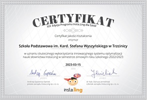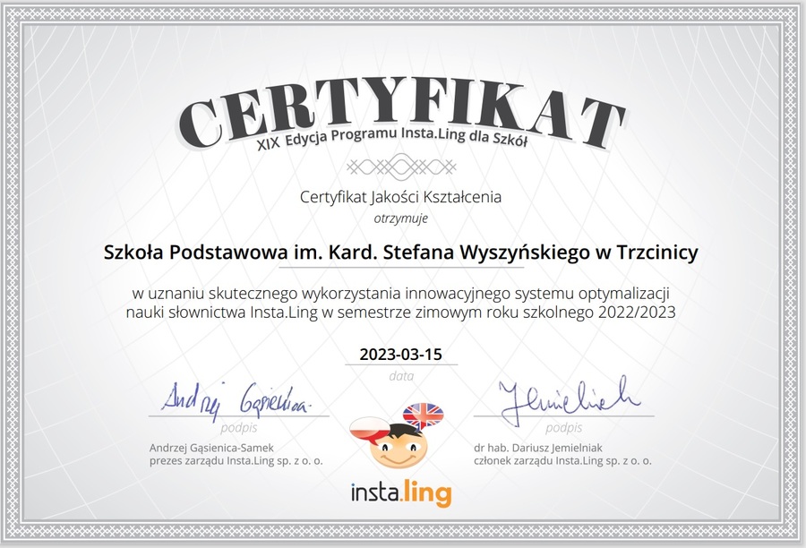 Wraz z końcem I półrocza zakończyliśmy XIX Edycję Programu InstaLing dla Szkół, za którą nasza szkoła otrzymała Certyfikat Jakości Kształcenia.