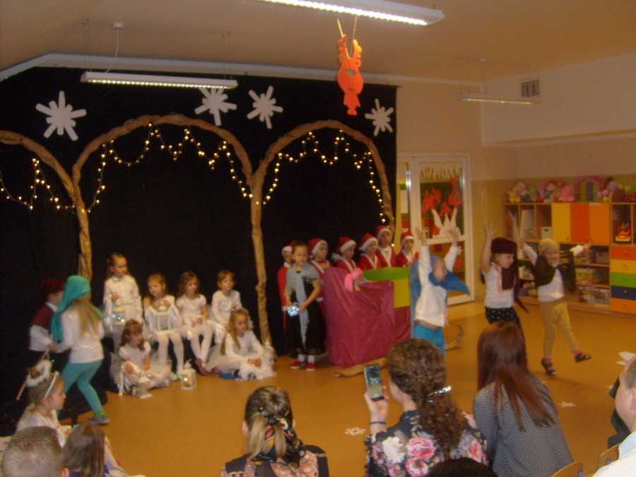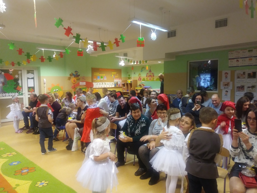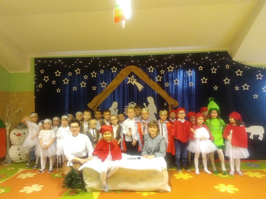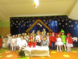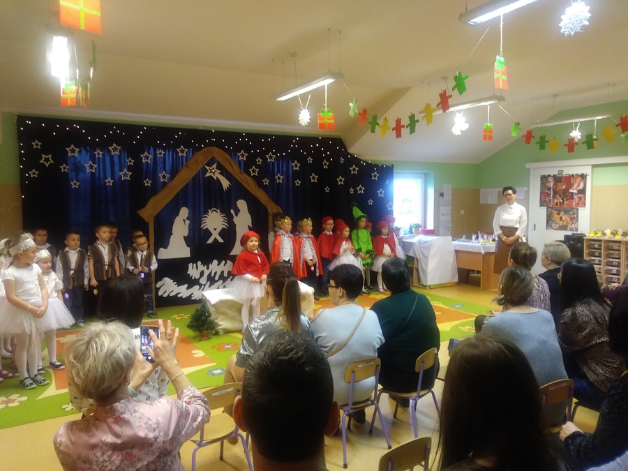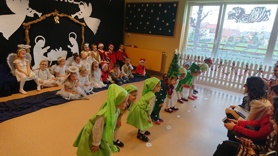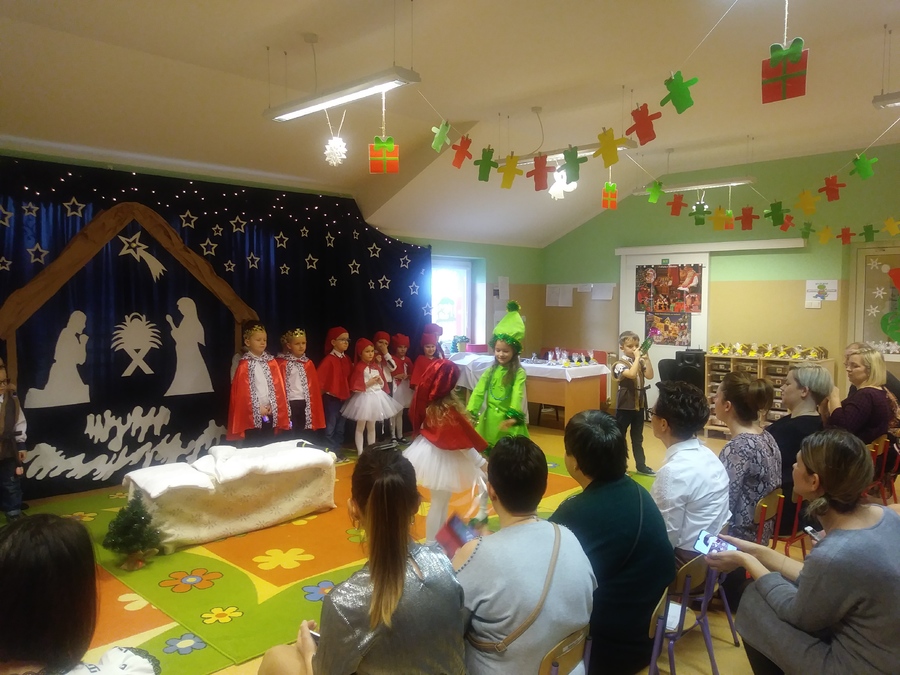 17 grudnia 2019r.dzieci z grup przedszkolnych „Krasnoludki” i „Jeżyki”, a 18 grudnia 2019r. dzieci z grup „Muchomorki” i „Smoki Dinusie” zaprosiły rodziców, aby zaprezentować im bożonarodzeniowe przedstawienia. W tych dniach przedszkolem zawładnęły: Aniołki, Mikołaje, Choinki, Pasterze, Królowie i inne postacie z Jasełek. W każdej z sal, w specjalnie przygotowanej scenografii, dzieci recytując, mówiąc, śpiewając, a także ruchem zaprezentowały swoje przygotowanie do przeżywania Świąt Bożego Narodzenia. Całość dopełniły stroje przygotowane przez rodziców, nauczycielki i Radę Rodziców.