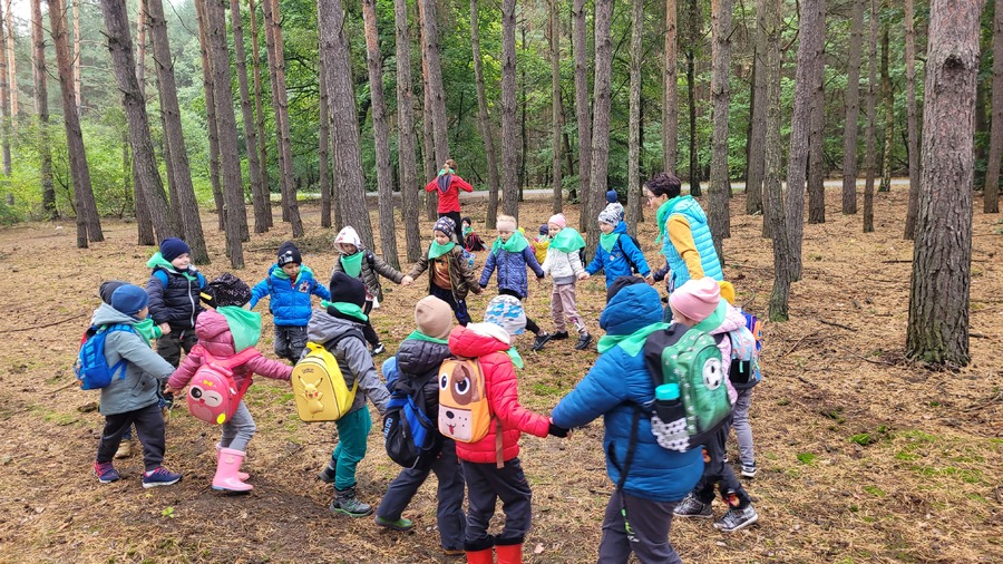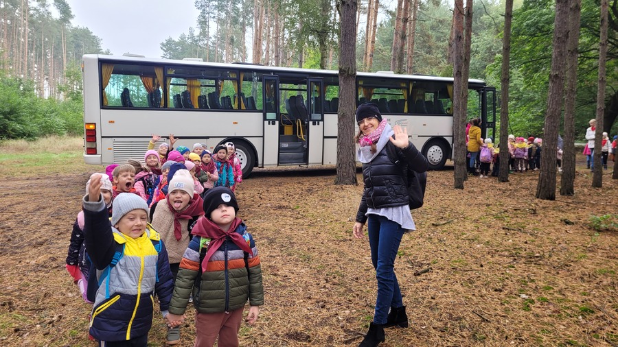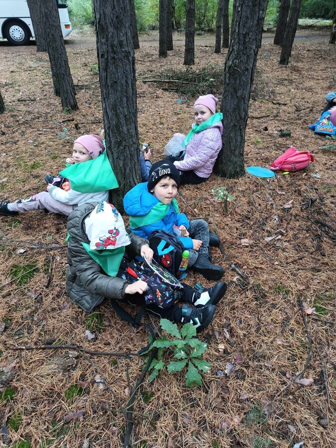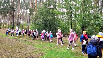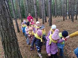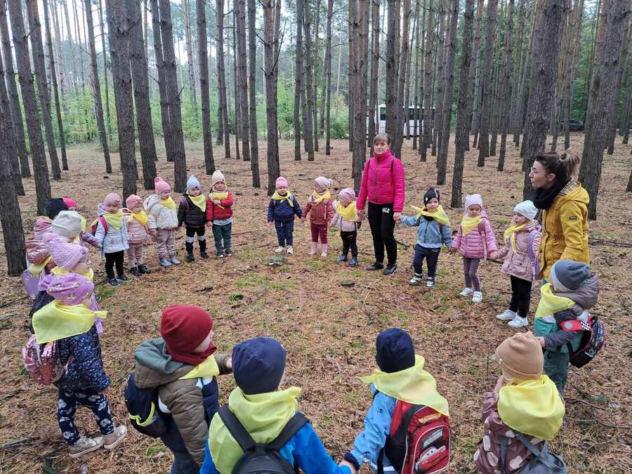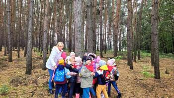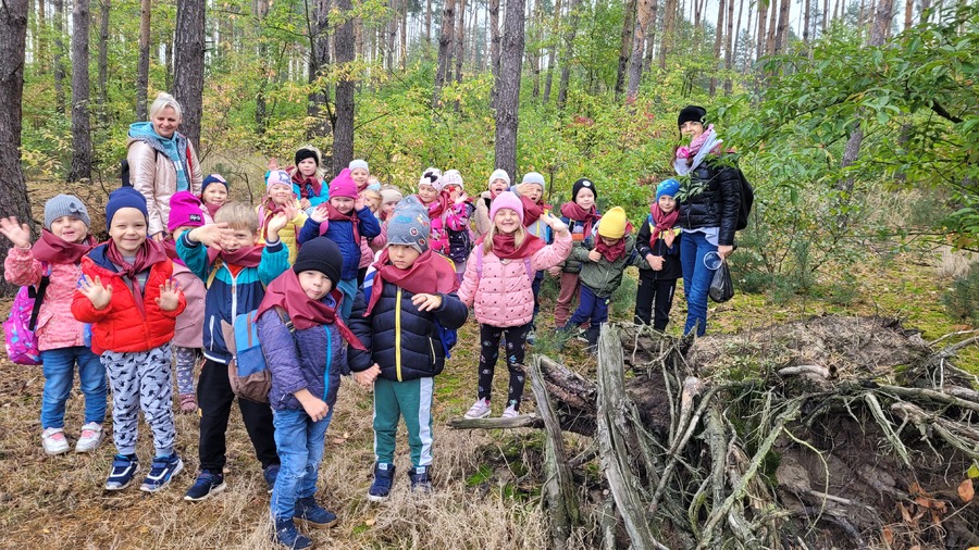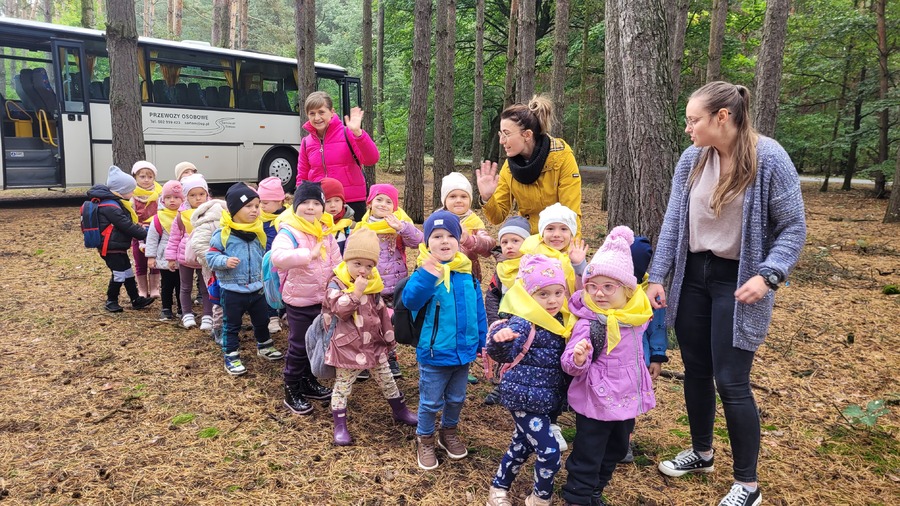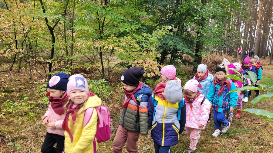 10 października - w ciepłe, jesienne przedpołudnie wszystkie przedszkolaki udały się na wycieczkę do lasu. Była to dobra okazja do świętowania Dnia Drzewa. Dzieci wędrując dróżkami poznawały przyrodę patrząc, słuchając, dotykając. Z zaciekawieniem przyglądały się jesiennym drzewostanom i leśnym krzewom.