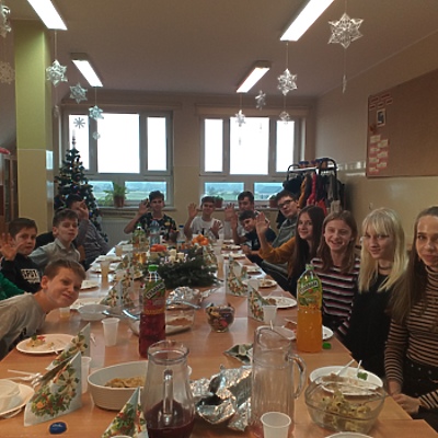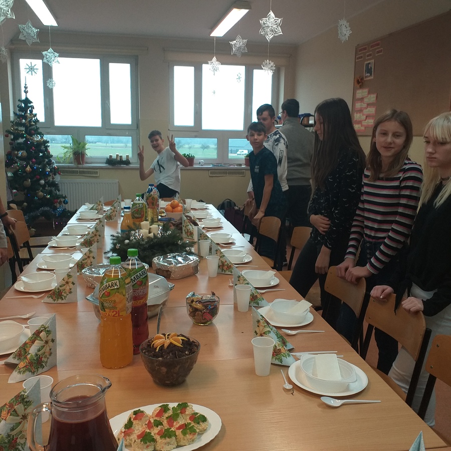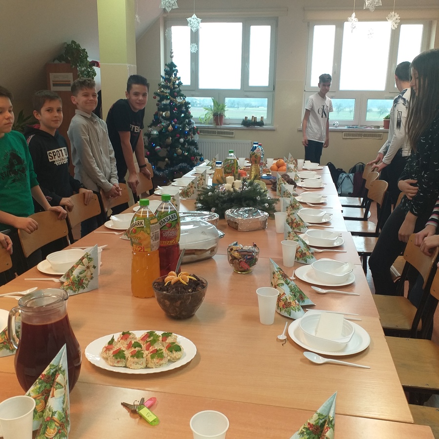16 grudnia takie spotkanie odbyło się w klasie VIIb. W świątecznie przystrojonej klasie, uczniowie samodzielnie przygotowali stół wigilijny. Dzielili się opłatkiem, składali sobie życzenia, a wigilijny posiłek poprzedziła wspólna modlitwa. Wspaniale spisali się rodzice uczniów, którzy przygotowali cudowne, domowe potrawy i dostarczyli je gorące na czas. Co wychowawca i uczniowie doceniają i za co serdecznie dziękują!