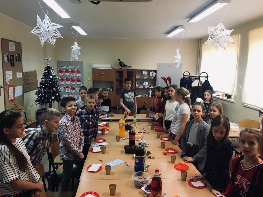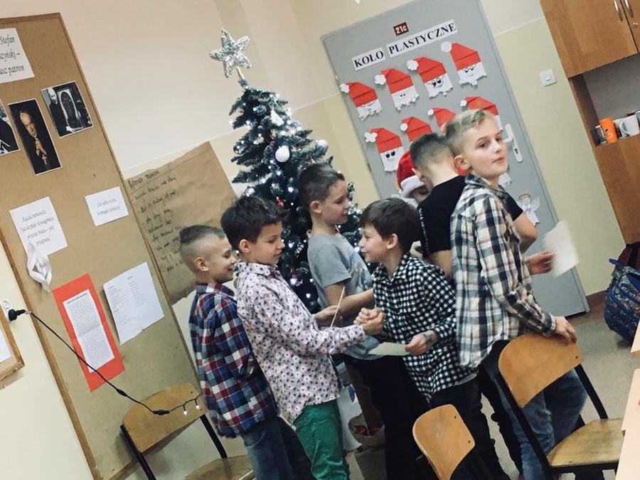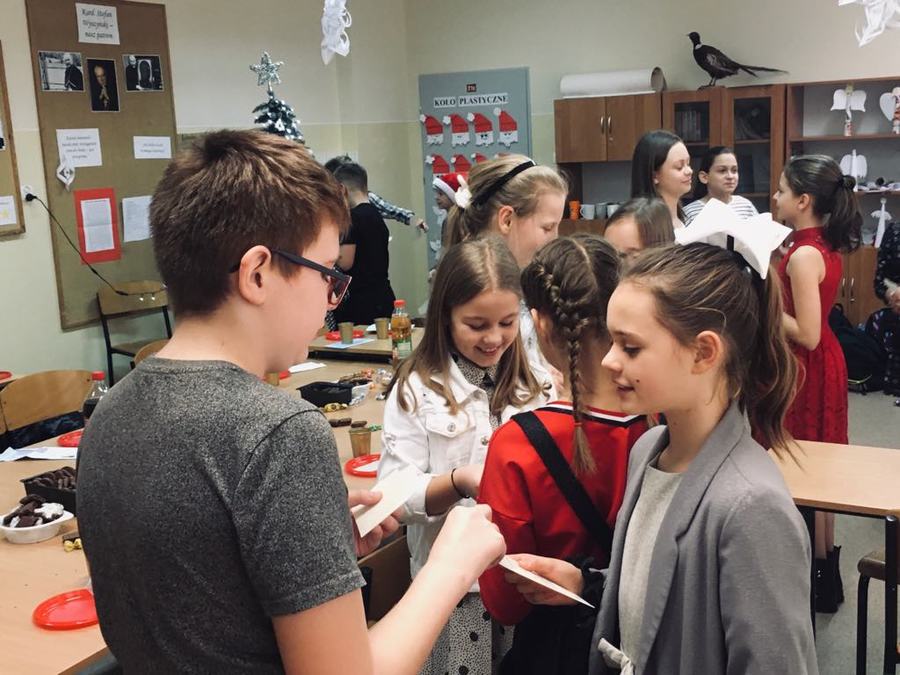 18 grudnia takie spotkanie odbyło się w klasie Va. Przy blasku choinki uczniowie dzielili się opłatkiem i składali sobie życzenia. Później zasiedli do stołu, gdzie częstowali się słodkościami i owocami. Nie zabrakło także wspólnego kolędowania oraz pamiątkowych zdjęć.