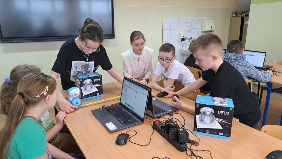 Pod czujnym okiem starszych kolegów z piątej klasy wzbogacali swoje doświadczenia w zakresie programowania. Uczestnicy zajęć byli poruszeni możliwościami tego podstawowego sprzętu. Już teraz czekają na kolejny etap programowania w klasie czwartej, na który zaprosiła ich pani Magdalena Wypych - opiekun pracowni informatycznej i pracowni robotyki.