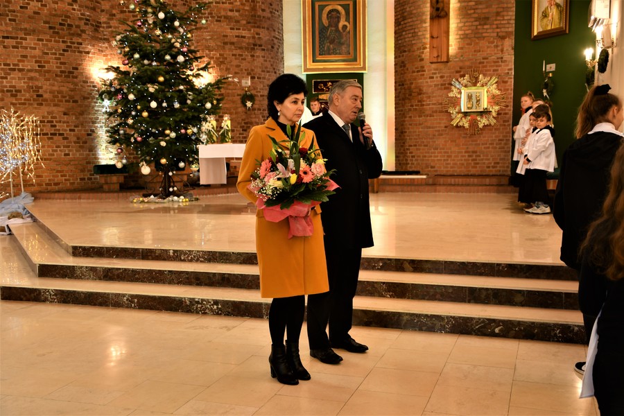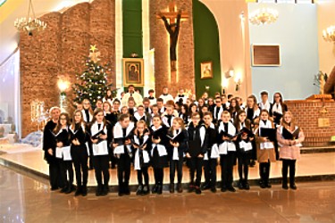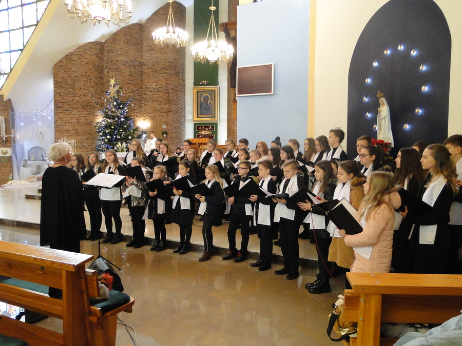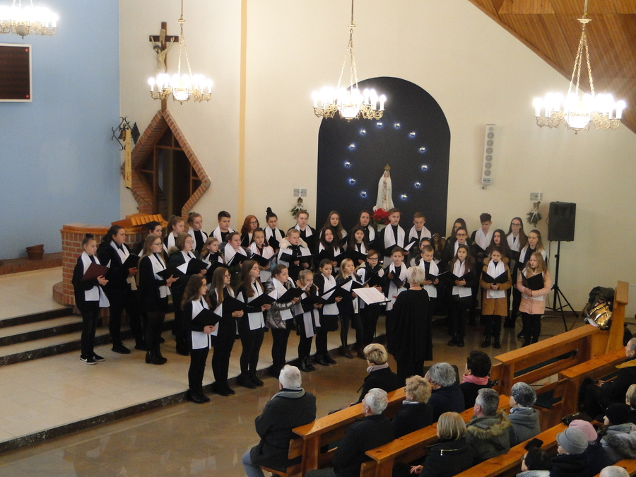 5 stycznia br. nasz Szkolny Chór (wzmocniony głosami absolwentów) gościnnie kolędował w kościele pod wezwaniem Matki Boskiej Częstochowskiej w Hanulinie. Chórzyści pojawili się tam na zaproszenie miejscowego proboszcza, księdza Marka Naglera. Kolędowali tuż przed Mszą Świętą, jak również podczas trwania całej Eucharystii, czym zaskarbili sobie sympatię wiernych uczestniczących w nabożeństwie. Świadczyły o tym gromkie brawa na zakończenie Mszy Świętej oraz słowa jakimi przedstawiciele Rady Parafialnej w Hanulinie dziękowali chórzystom. Były ciepłe słowa księdza proboszcza Marka, kwiaty dla dyrygentki i czekolady dla śpiewających. W tym poświątecznym eucharystycznym spotkaniu uczestniczyło wielu rodziców naszych śpiewających artystów.