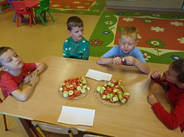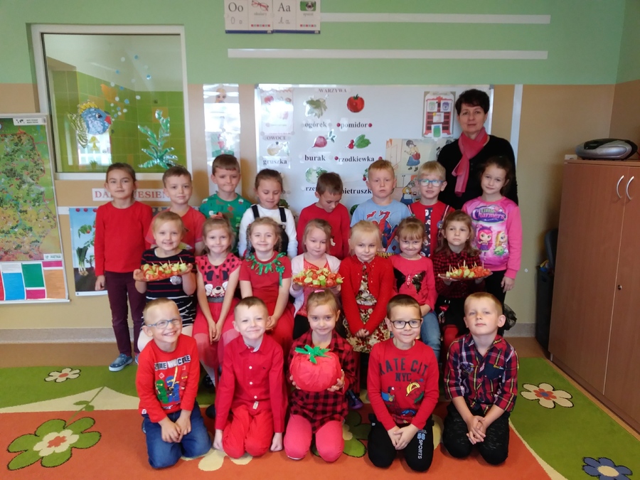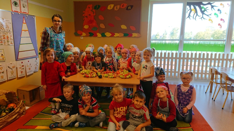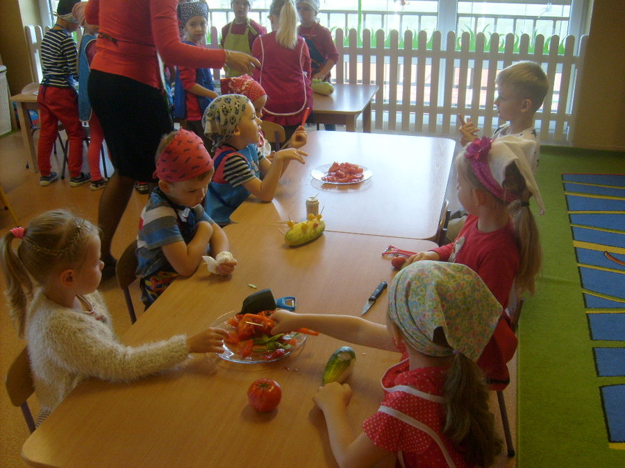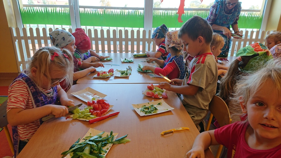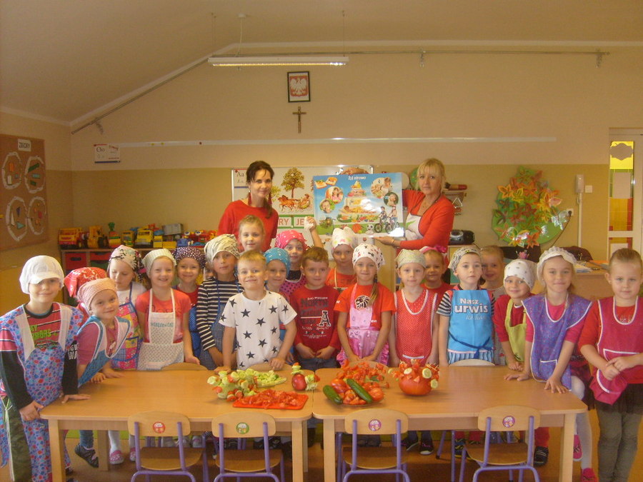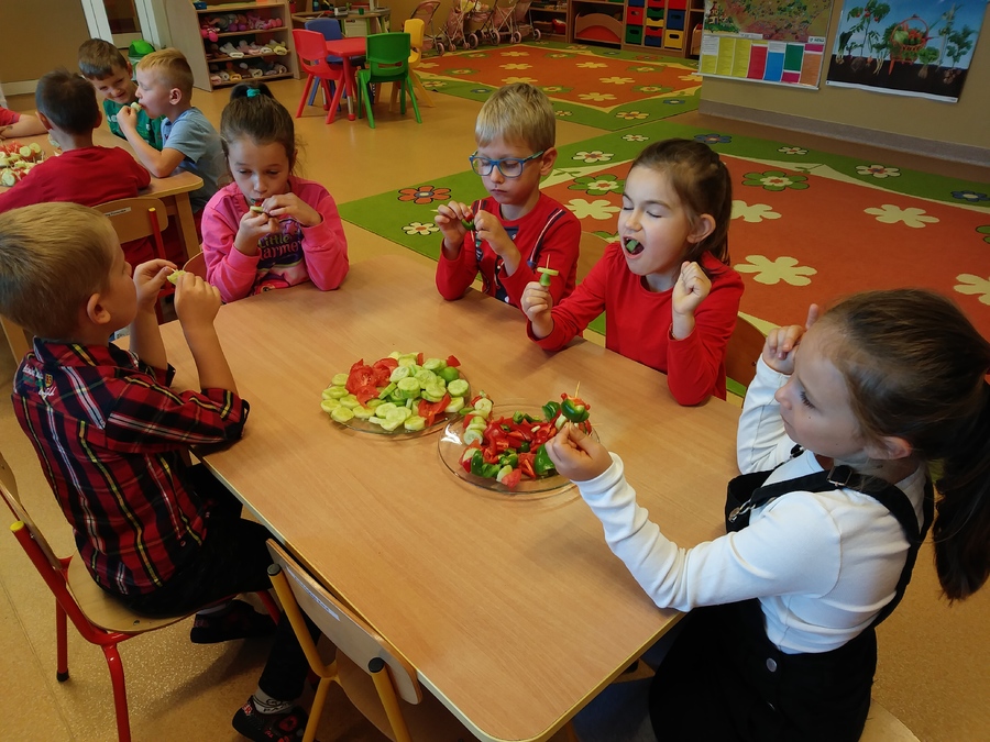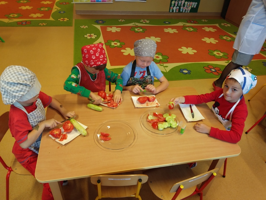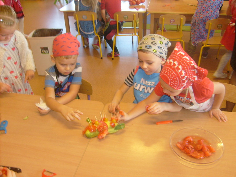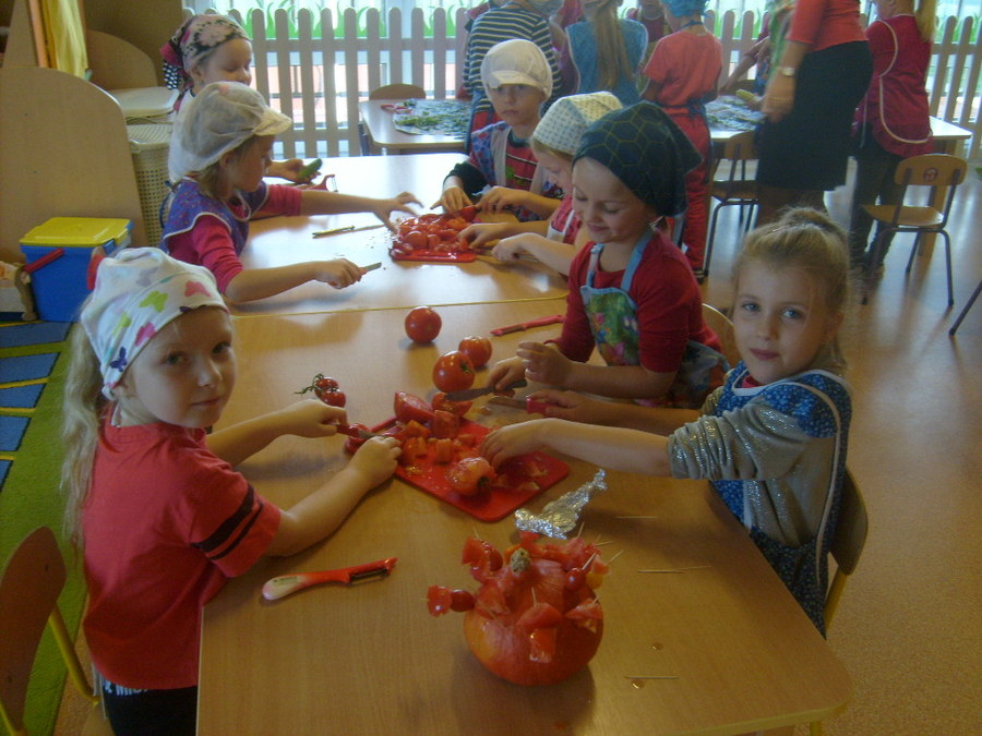 W tym dniu „Jeżyki” „Muchomorki” i „Smoki Dinusie” zorganizowały „Dzień pomidora”, to warzywo było głównym składnikiem przygotowywanych sałatek, które później dzieci zjadały. Oczywiście wykorzystywane były z kącików przyrody jeszcze inne eksponaty, aby wzbogacić smakowo i kolorystycznie przygotowane witaminowe smakołyki. Kilka dni wcześniej dzieci z grupy „Krasnoludki” na podsumowanie tygodnia o darach jesieni wspólnie z paniami przygotowały sałatkę owocową. Zanim przystąpiły do pracy uczyły się zasad bezpiecznego zachowania się w kuchni. Po wspólnej pracy wszystkie dzieci z ochotą kosztowały zdrowej sałatki.