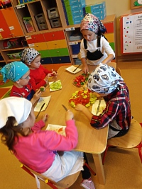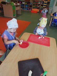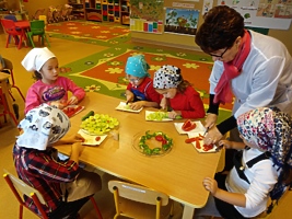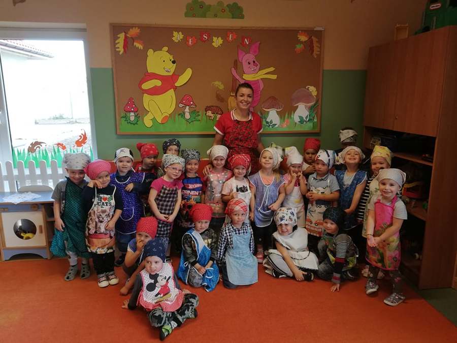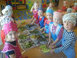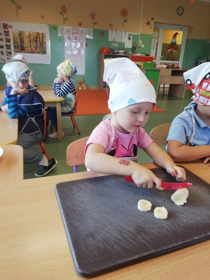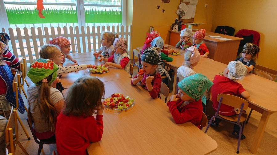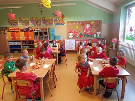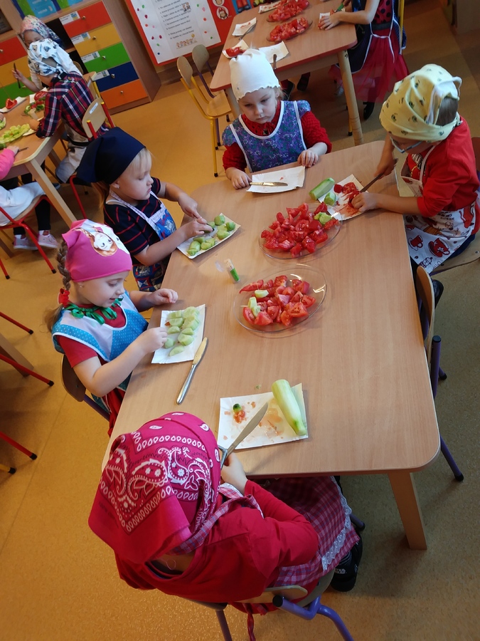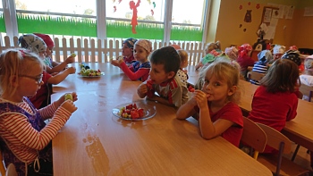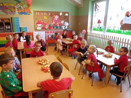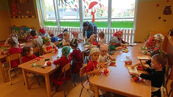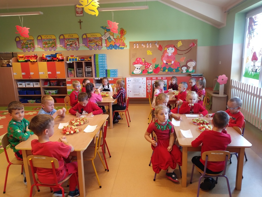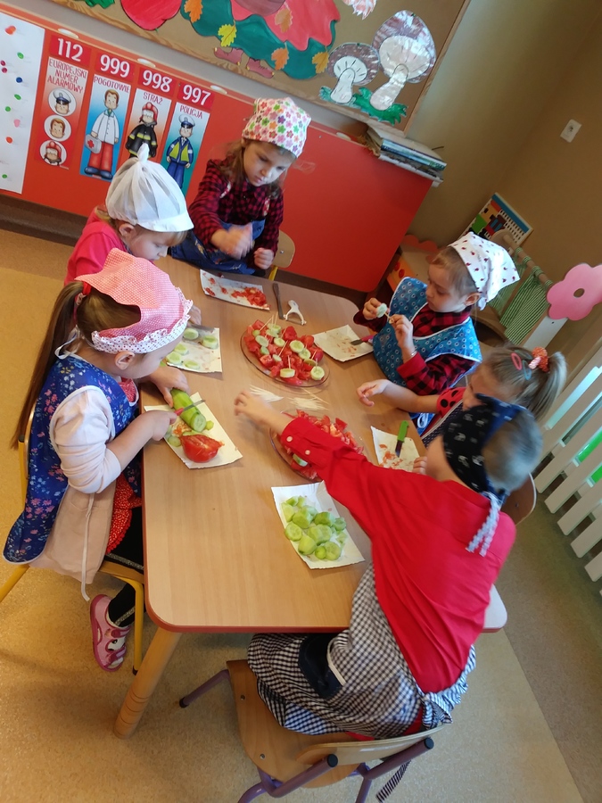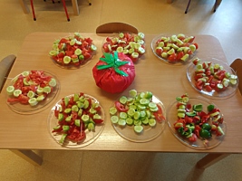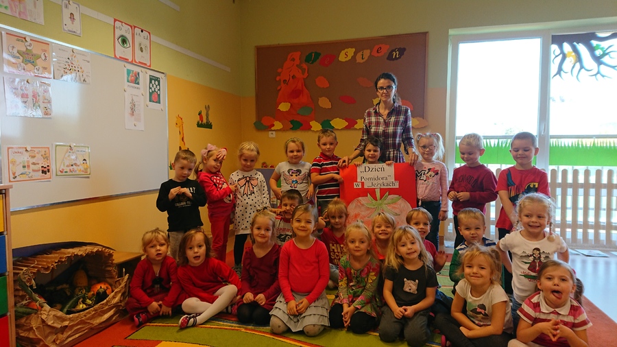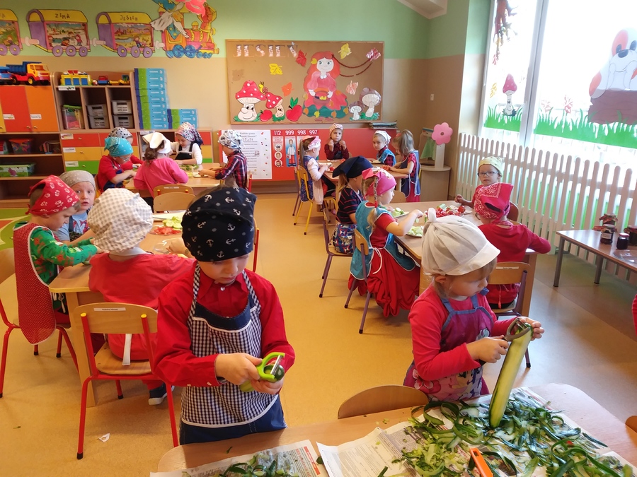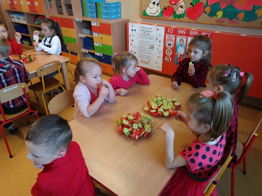 W tym dniu „Jeżyki” „Muchomorki” i „Smoki Dinusie” zorganizowały „Dzień pomidora”, to warzywo było głównym składnikiem przygotowywanych sałatek, które później dzieci zjadały. Oczywiście wykorzystywane były z kącików przyrody jeszcze inne eksponaty, aby wzbogacić smakowo i kolorystycznie przygotowane witaminowe smakołyki. Kilka dni wcześniej dzieci z grupy „Krasnoludki” na podsumowanie tygodnia o darach jesieni wspólnie z paniami przygotowały sałatkę owocową. Zanim przystąpiły do pracy uczyły się zasad bezpiecznego zachowania się w kuchni. Po wspólnej pracy wszystkie dzieci z ochotą kosztowały zdrowej sałatki.