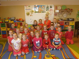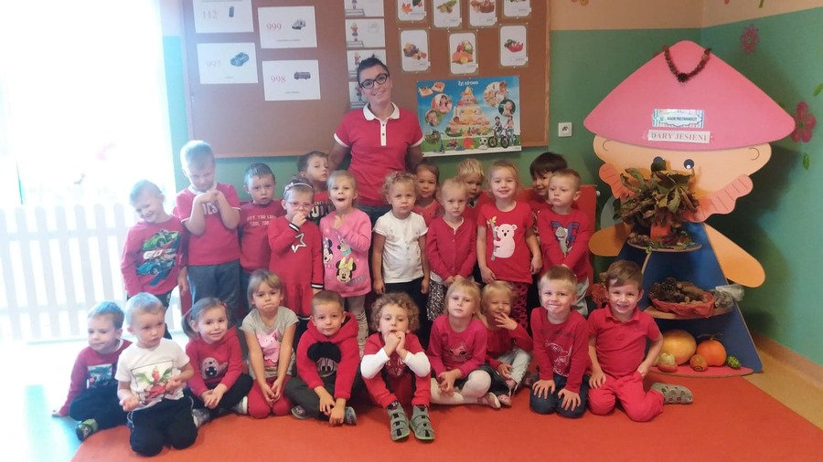 7 października br. był dniem czerwonym w naszym przedszkolu. W tym dniu dzieci w kolorach czerwonych przybyły do przedszkola. W każdej sali znajdują się kąciki przyrody, w których gromadzone są dary jesieni, podzielone na te z lasu, pola i ogrodu. Wśród nich pojawiły się czerwone owoce i warzywa. Podczas zajęć rozmowy prowadzone na temat owoców i warzyw dostarczyły dzieciom wiele wiadomości nie tylko skąd się biorą, kto zajmuje się ich uprawą, ale również jakie przetwory i zdrowe dania można z tych warzyw i owoców przygotować.