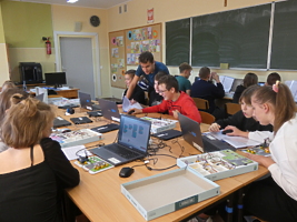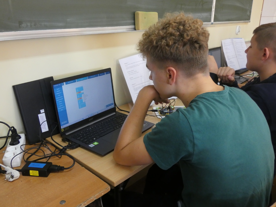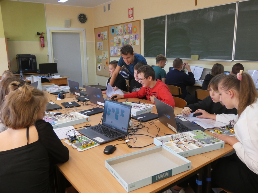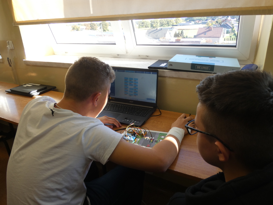 Klasy 8 zajęły się mechatroniką i z zestawami BE CREO zakupionymi w ramach Laboratoriów Przyszłości. Uczniowie programowali symulatory świateł drogowych. Diody nie zawsze chciały świecić lub migać we właściwy sposób, a na wyświetlaczu nie chciały się pojawić zaprojektowane napisy lub obrazy. Prace są już dość zaawansowane. Finał jest przewidziany na grudzień.